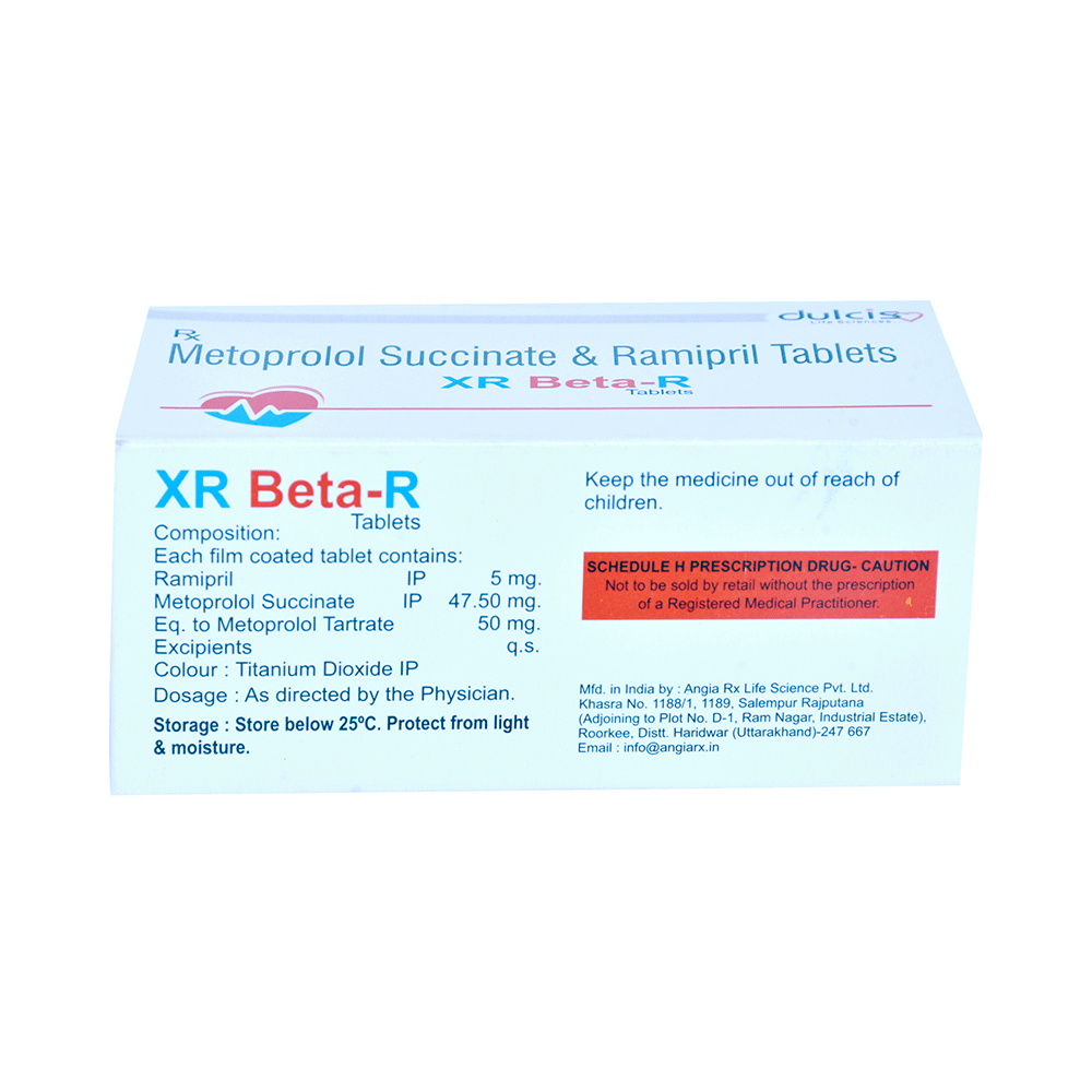 XR Beta-R Tablet is a combination of two medicines: Metoprolol and ramipril which lower blood pressure effectively. Metoprolol is a beta blocker which works by slowing down the heart rate and makes the heart more efficient at pumping blood around the body. Ramipril is an ACE inhibitor which reduces stress on the heart and relaxes blood vessel so that blood flows more smoothly.