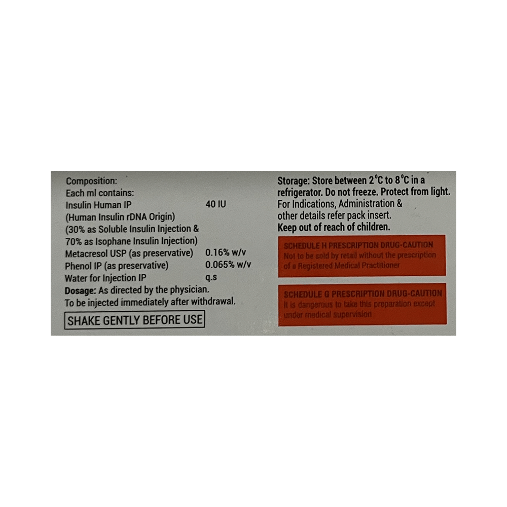 In DiabetesXsulin 30/70 Suspension for Injection is a short-acting type of insulin that is usually used along with other diabetes medication for controlling blood sugar levels. It replaces the insulin that is normally produced in the body. This helps the glucose get into your muscle and fat cells so your body can use it for energy. It also decreases glucose production in the liver. Lowering of blood sugar level helps reduce the risk of getting any of the serious complications of diabetes such as kidney damage, eye damage, nerve problems, and loss of limbs. Learn exactly how, where, and when to inject this insulin for it to be most effective. Take it regularly along with proper diet and exercise for a normal, healthy life.