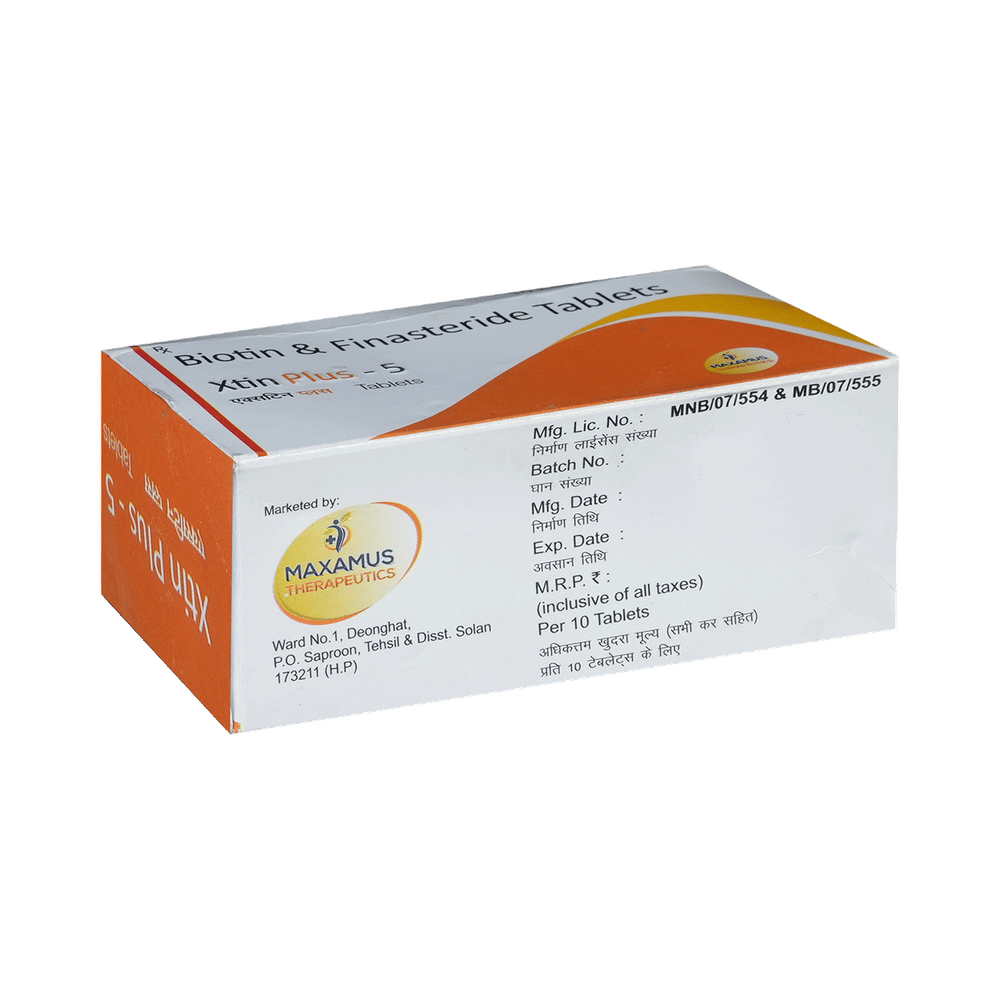 Xtin Plus Tablet is a combination of two medicines: Biotin and Finasteride which treat hair loss. Biotin is a form of vitamin B. It is involved in the synthesis of keratin, a natural protein that aids in hair growth. Finasteride is a 5-alpha reductase inhibitor. It blocks the body's production of a male hormone in the scalp that stops hair growth, thereby reversing the balding process and preventing further hair loss.