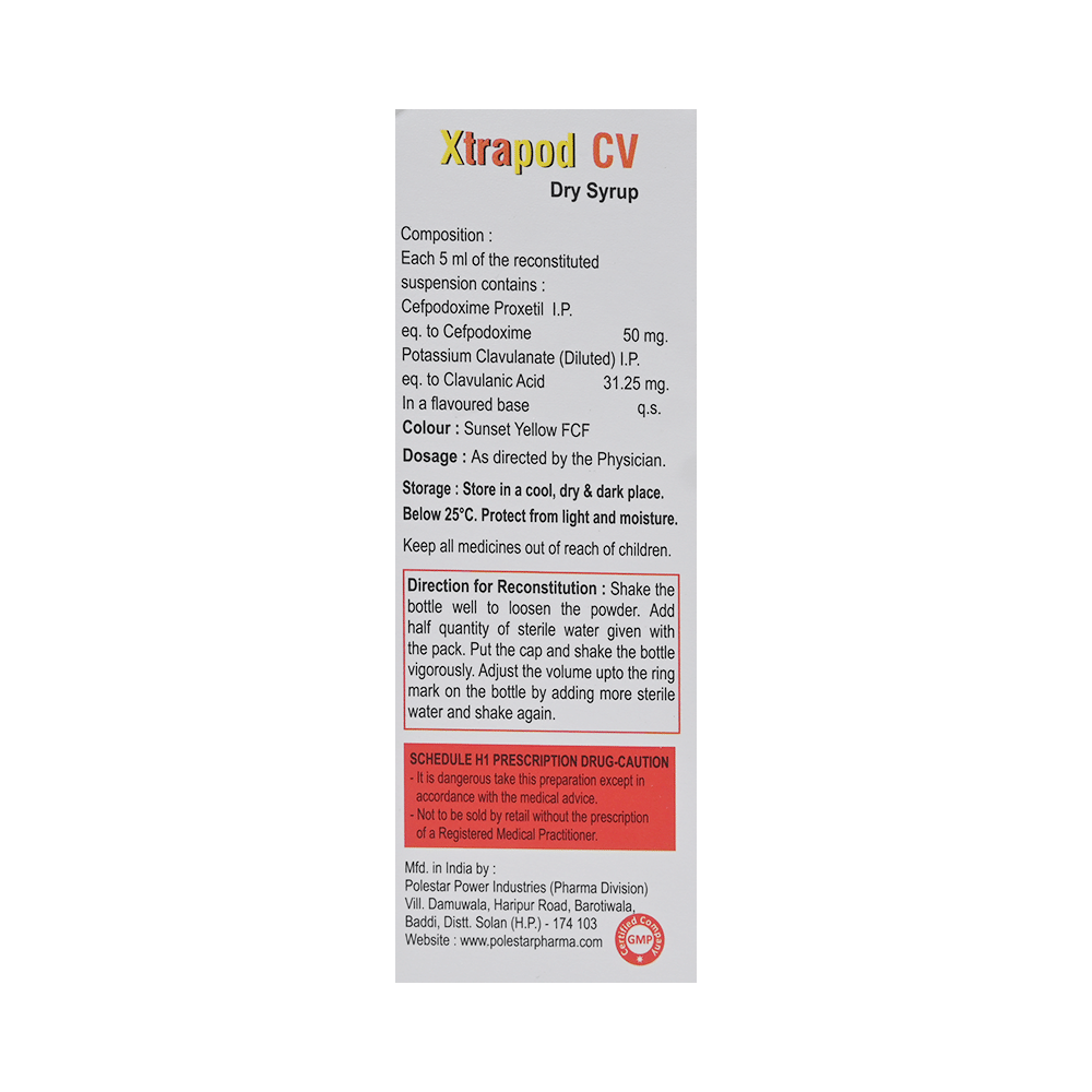 Xtrapod-CV Dry Syrup is a potent antibiotic made up of two active medicines. It is given to children to treat a wide range of severe bacterial infections targeting the ear, throat, lungs, skin, and urinary tract. It works by inhibiting the growth of bacteria thereby preventing the infection spread. Give this medicine to your child an hour before or two hours after meals. If your child develops a stomach upset, prefer giving it with food. Make sure to stick to the prescribed dose because it is given keeping in mind the type of infection, its severity, and the age and bodyweight of your child. In case your child gags and expels the medicine within 30 mins of intake, repeat the same dose but do not double dose if it's the time for the next dose.Some of the minor and temporary side effects of this medicine include vomiting, diarrhea, nausea, rash, and headache. Usually, these episodes subside once your child’s body adapts to the medicine. However, if these effects persist or become bothersome for your child, call the doctor right away.Narrate your child’s complete medical history to your child’s doctor, including any previous episodes of allergy, heart problem, blood disorder, birth defects, airway obstruction, lung anomaly, gastrointestinal problem, skin disorder, liver impairment, and kidney malfunction. This information is critical for dose alterations and for planning your child’s overall treatment.
