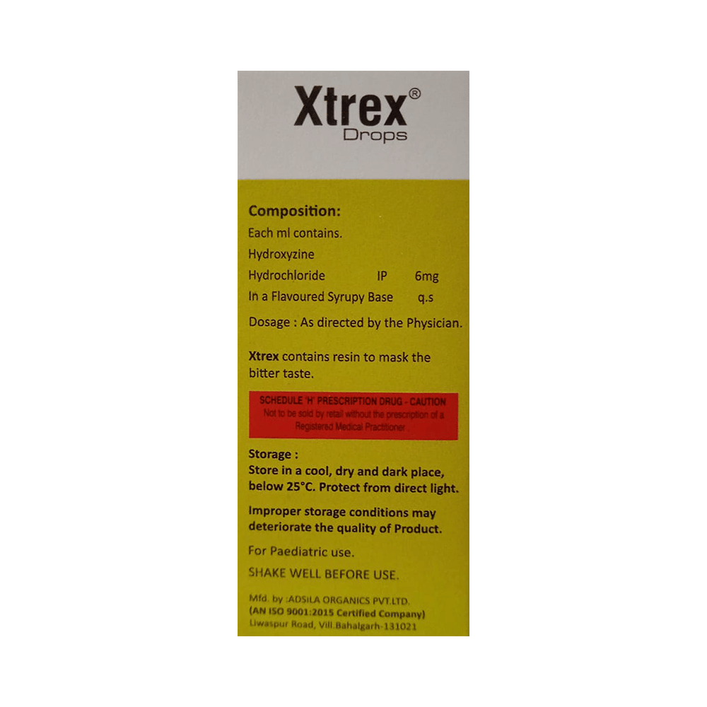 Xtrex Drops is used to treat symptoms of skin allergy like itching, swelling, and rashes in conditions such as eczema, dermatitis, and psoriasis. It is also used to treat anxiety and helps to relax before or after surgery. Xtrex Drops should be taken with or without food. Take it exactly as your doctor has prescribed. The dose and how often you take it depend on what you are taking it for. Your doctor will decide how much you need to improve your symptoms. Take it for as long as it is prescribed for you. In case you have missed any doses, take the next dose as soon as you remember it. However, you should never take a double dose.The most common side effects of this medicine include drowsiness, dizziness, blurred vision, constipation, and dry mouth. If these bother you or appear serious, let your doctor know. There may be ways of reducing or preventing them.Before taking this medicine, let your doctor know if you have heart problems, high blood pressure, or liver or kidney problems. Inform your doctor if you are pregnant or breastfeeding. Your doctor should also know about all other medicines you are taking, as many of these may make this medicine less effective or change the way it works. Generally, it is advised to avoid alcohol while on treatment.
