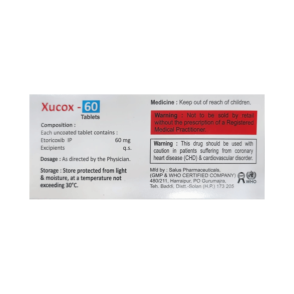 Xucox 60 Tablet is a pain-relieving medicine. It is used for relieving moderate pain and swelling of joints associated with different forms of gout and arthritis. It is also used for short-term treatment of moderate pain after dental surgery. Xucox 60 Tablet can be taken with or without food. The dose depends on what you are taking it for and how well it helps your symptoms. You should take it as advised by your doctor. Do not take more or use it for longer than recommended.The most common side effects of this medicine include stomach pain, heartburn, nausea, edema, dizziness, headache, and discoloration of the skin. These are not usually serious, but if you are worried, ask your doctor about ways of reducing or preventing them.Before taking it, you should let your doctor know if you have a history of ulcers or bleeding in your stomach, high blood pressure, or any trouble with your heart, kidneys, or liver. Let your doctor also know about all the other medicines you are taking because they may affect, or be affected by, this medicine. Pregnant or breastfeeding women should consult their doctor before starting treatment.