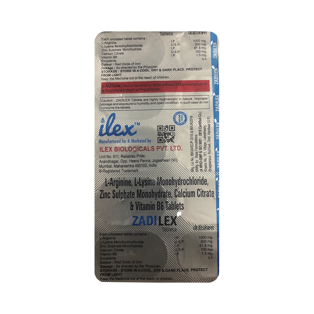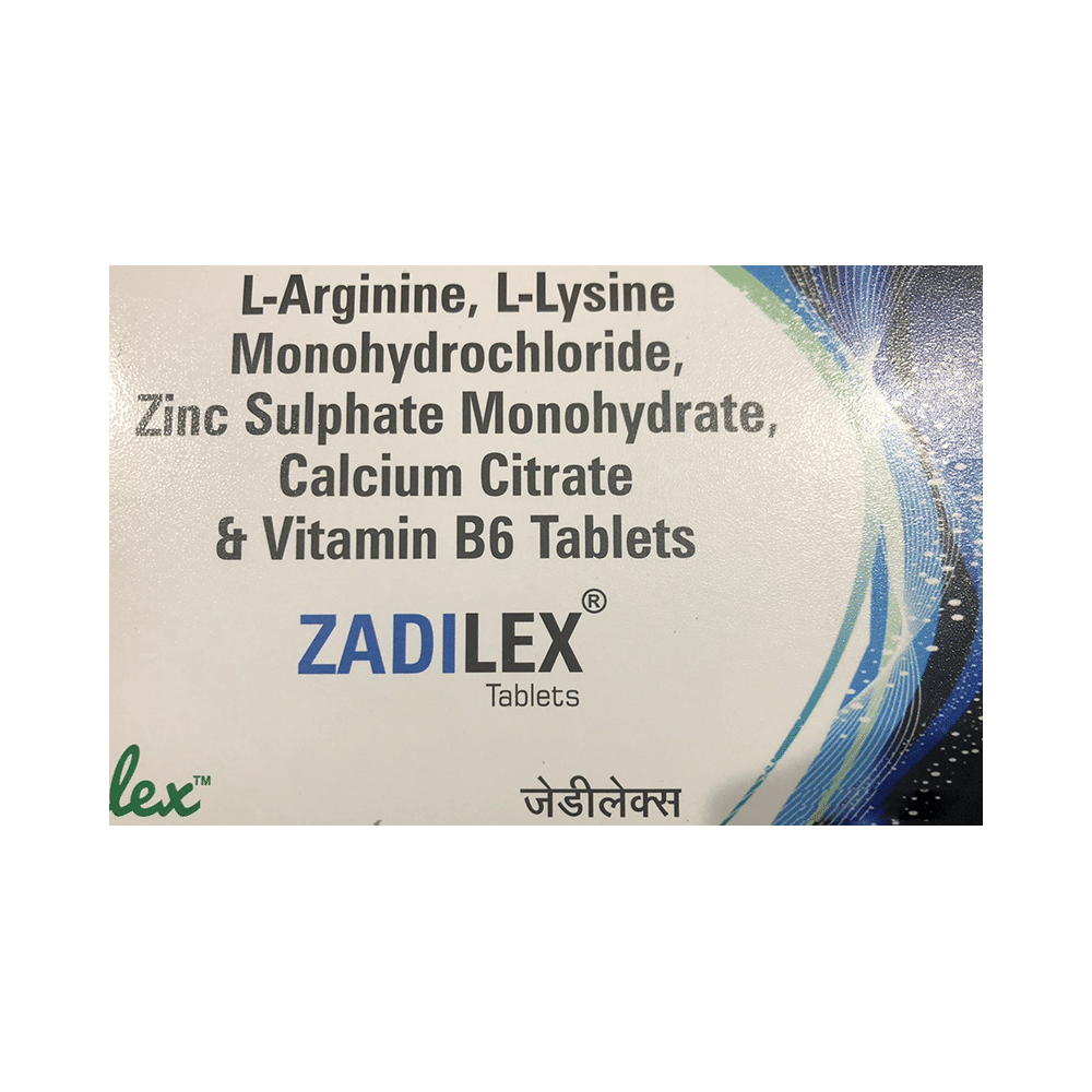 Zadilex Tablet is a combination of amino acids, vitamins, and minerals. Calcium citrate prevents or treats negative calcium balance. L-arginine is converted into a chemical called nitric oxide that relaxes blood vessels for improved blood flow. It also stimulates the release of growth hormone, insulin, and other substances in the body. L-Lysine is a necessary building block for all proteins in the body. It plays a significant role in building muscle protein, absorbing calcium, recovering from surgery or sports injuries, and bodily production of hormones, enzymes, and antibodies. Pyridoxine treats or prevents the deficiency of vitamin B6 and improves the functioning of the nervous and immune systems. Zinc is needed for the body's immune system to work properly. It plays a role in growth, wound healing, and maintaining gut health. It is also needed for the senses of taste and smell.