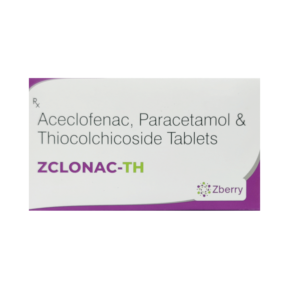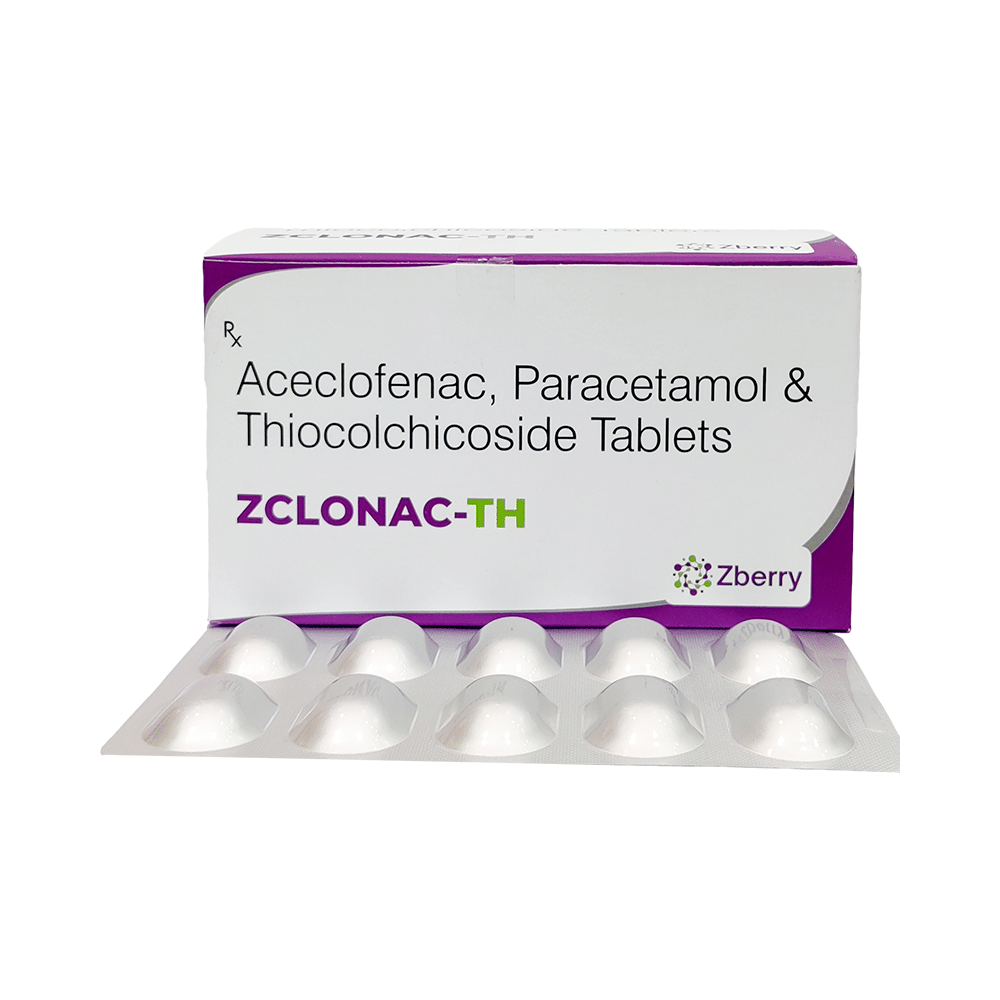 Zclonac-TH Tablet is a combination medicine that helps in relieving muscular pain. It works by blocking the release of certain chemical messengers that cause pain, inflammation, and fever. This improves the movement of muscles and provides relief from pain and discomfort. Zclonac-TH Tablet should be taken with food. This will prevent you from getting an upset stomach. The dose and duration will depend on the severity of your condition. You should keep taking the medicine even if you feel better until the doctor says it is alright to stop using it.Using this medicine may cause few common side effects such as nausea, vomiting, heartburn, stomach pain, diarrhea, loss of appetite, and dryness in the mouth. If any of these side effects do not resolve with time or get worse, you should let your doctor know. Your doctor may be able to suggest ways of preventing or reducing the side effects. In general, you should try to use the smallest amount necessary to control your symptoms.Before using the medicine, you should tell your doctor if you have any other medical conditions or disorders. To make sure it is safe, you should let your doctor know all the other medicines you are taking. Also, tell your doctor if you have any problems with your liver or kidneys. You should avoid the consumption of alcohol while on treatment with this medicine. Pregnant and breastfeeding women should consult their doctors first before using the medicine.