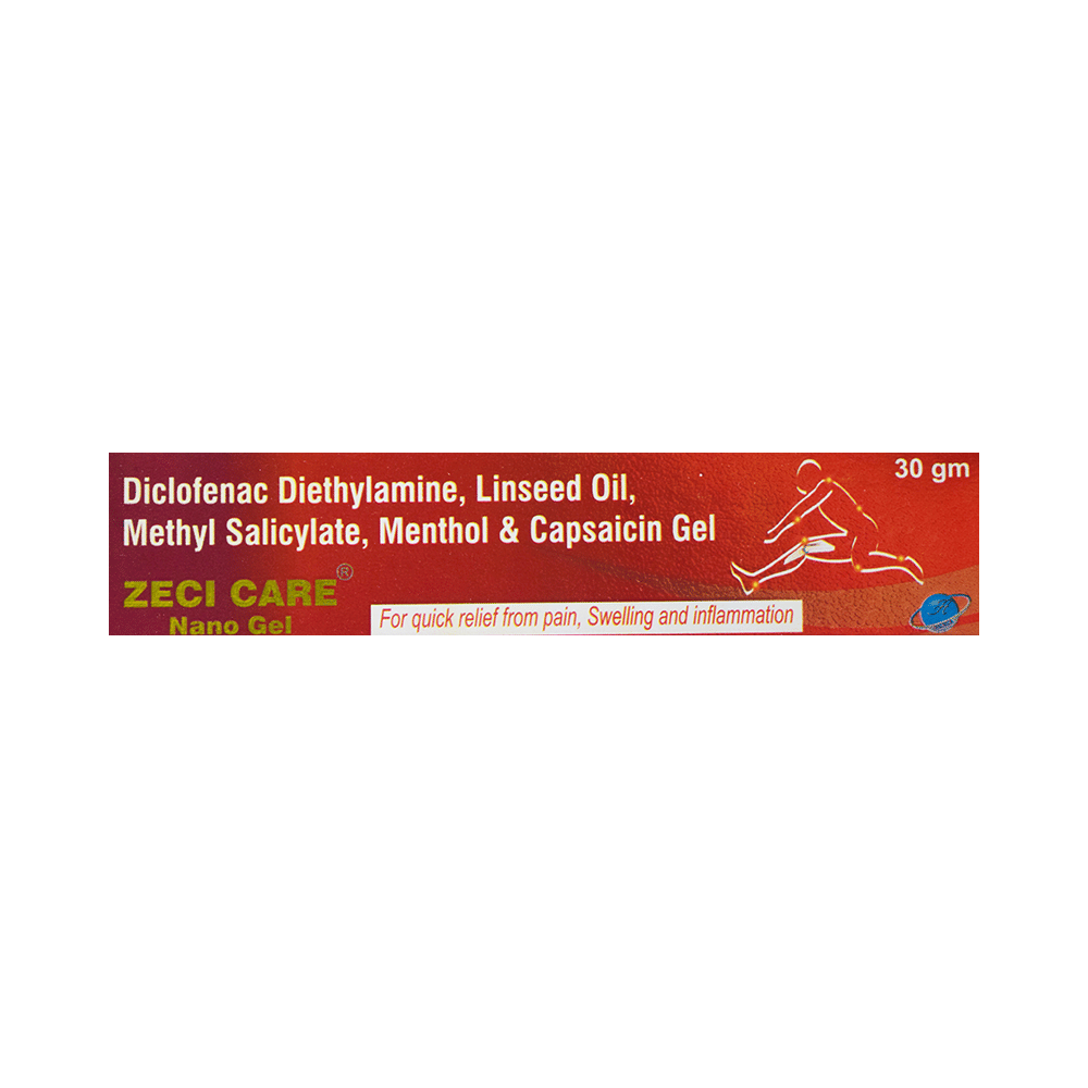 Zeci Care Nano Gel is a combination of four medicines: Diclofenac, Capsaicin, Methyl Salicylate, Menthol and Linseed Oil which relieves pain and inflammation. Diclofenac is a non-steroidal anti-inflammatory drug (NSAID) which works by blocking the release of certain chemical messengers in the brain that cause pain, fever, and inflammation (redness). Capsaicin works by blocking pain messages to the nerves. This relieves minor aches and pains in the muscles and joints. Methyl Salicylate and Menthol are topical analgesics (pain relievers). They work by first cooling the skin and then warming it up. This cooling and warming up action distracts from feeling the pain.