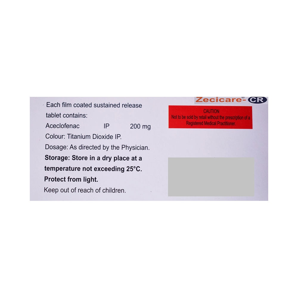 Zecicare-CR Tablet is a pain-relieving medicine. It alleviates pain and inflammation in conditions such as rheumatoid arthritis, ankylosing spondylitis, osteoarthritis, low back pain, dental pain, gynecological pain, and painful & inflammatory conditions of the ear, nose, and throat. Zecicare-CR Tablet should be taken at the dose and duration advised by your doctor. It should be taken with food or milk to prevent stomach upset. Taking the medicine regularly at the right times increases its effectiveness. It is important to continue taking it until your doctor tells you it is safe to stop.Vomiting, stomach pain, nausea, and indigestion are some of the common side effects of this medicine. It may also cause dizziness, drowsiness, or visual disturbances. If you take this medicine for long-term treatment, your doctor may regularly monitor your kidney function, liver function, and blood component levels. Long-term use may lead to serious complications, such as stomach bleeding and kidney problems. Zecicare-CR Tablet is not recommended if you are pregnant or breastfeeding.