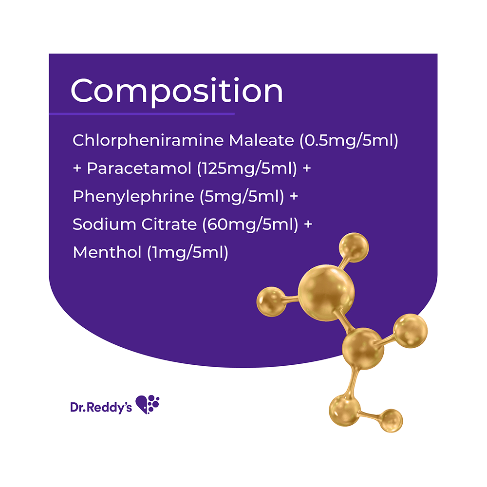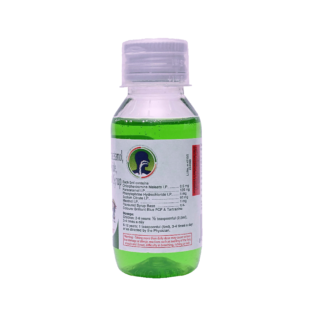 Salt Composition: Chlorpheniramine Maleate (0.5mg/5ml) + Paracetamol (125mg/5ml) + Phenylephrine (5mg/5ml) + Sodium Citrate (60mg/5ml) + Menthol (1mg/5ml)