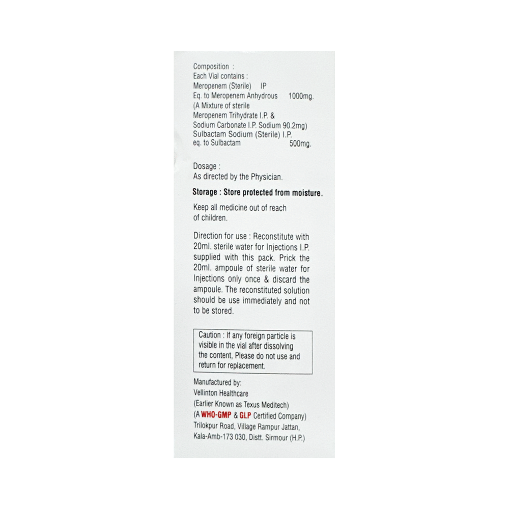 Salt Composition: Meropenem (1000mg) + Sulbactam (500mg)