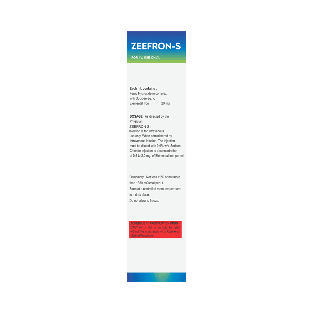 Zeefron-S Injection is an iron replacement medicine. It is used to treat a type of anemia where you have too few red blood cells because you have too little iron in your body (iron-deficiency anemia). Iron is needed to produce the red blood cells that carry oxygen around your body. Zeefron-S Injection is given by slow infusion (drip) into a vein by your doctor or nurse. Your doctor will decide the dose you need and how many injections you should have to improve your anemia. It will also help to eat a well-balanced diet that has enough iron. Good sources of iron include pulses (dal), green leafy vegetables like spinach, beans, eggs, dry fruits, and non-vegetarian foods.The most common side effects include altered taste, hypertension (high blood pressure), nausea, and injection site reactions (such as pain, redness, and swelling). Some people may develop a temporary fall in blood pressure (hypotension) if this medicine is given too rapidly. Your doctor will also monitor you for signs of an allergic reaction such as breathlessness, dizziness, feeling uneasy, hives, swelling of face, tongue, and throat, etc. while this medicine is being given. If you are bothered by them or they go on for longer, talk to your doctor or nurse.You should not have this medicine if your anemia is not caused by a lack of iron. Before taking it, tell your doctor if you have rheumatoid arthritis, asthma or other allergies, high blood pressure, or liver problems. This may affect your treatment. It is not known whether this medicine is safe for use if you are pregnant or breastfeeding so please take advice from your doctor. You will have tests to check your blood cells and iron levels, monitor your progress and check for side effects. It may be advisable to limit alcohol during treatment.