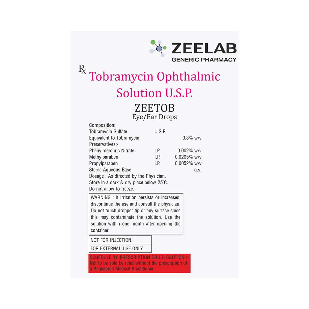 Zeetob Eye Drop is an antibiotic medicine that is used to treat bacterial infections of the eye (e.g., conjunctivitis), eyelids (e.g., blepharitis), and ear. It may also help to prevent an infection after an eye injury or surgery. Zeetob Eye Drop stops the growth of bacteria and thereby helps to cure the underlying infection. Follow your doctor’s instructions precisely for administering this medicine. Wait for at least 5 minutes before applying any other eye or ear medication. It should be used regularly at evenly spaced time intervals as prescribed by your doctor. Do not skip any doses and finish the full course of treatment even if you feel better. Stopping the medicine too early may lead to the infection returning or worsening.Zeetob Eye Drop will not work for eye or ear infections that are not caused by bacteria (e.g., viral) and therefore, should only be used if prescribed by your doctor. Unnecessary use of any antibiotic can lead to a decrease in its effectiveness in the future.Common side effects seen with this medicine include temporary irritation, burning sensation, itching, and redness after administration. Consult your doctor if these side effects persist or if your condition worsens. It may cause some short-term blurring of vision when first used. Therefore, do not drive immediately after administering this medicine. Contact lenses should not be worn while you are using this medicine or while you have an active eye infection.