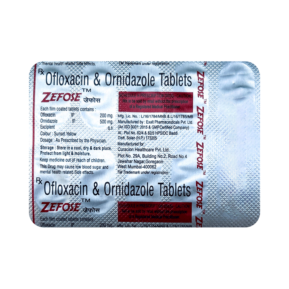 Zefose Tablet is a combination of two antibiotics: Ofloxacin and Ornidazole. Ofloxacin works by preventing the bacterial cells from dividing and repairing, thereby killing the bacteria. Ornidazole kills parasites and anaerobic bacteria that cause infections by damaging their DNA. Together, they treat your infection effectively.