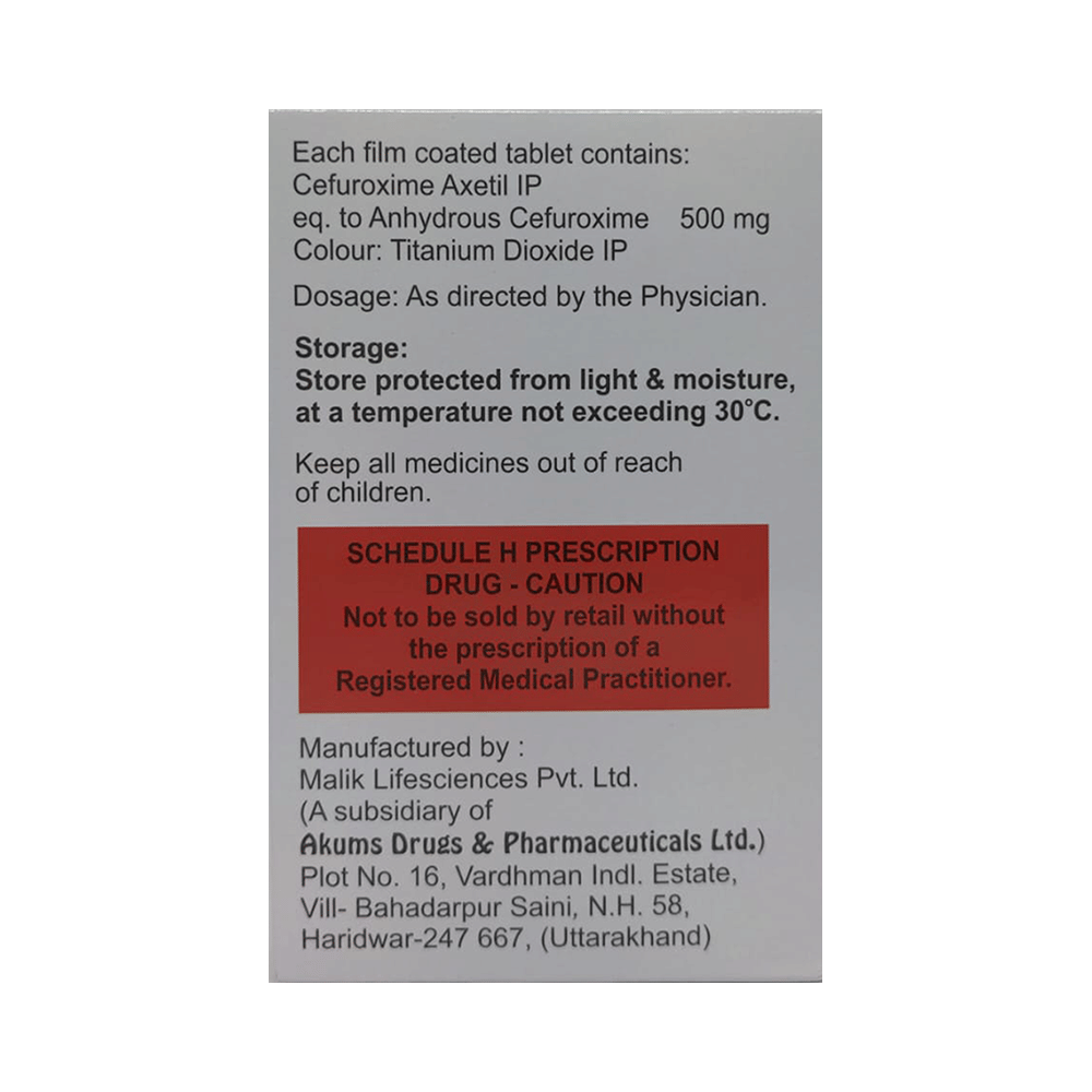 Zefurox 500 Tablet is an antibiotic medicine used to treat bacterial infections in your body. It is effective in infections of the lungs (e.g., pneumonia), ear, throat, nasal sinus, urinary tract, skin, soft tissues, bones, and joints. It is also used to prevent infections during surgery. Zefurox 500 Tablet should be taken with food to avoid an upset stomach. You should take it regularly at evenly spaced intervals as per the schedule prescribed by your doctor. Taking it at the same time every day will help you to remember to take it. The dose will depend on what you are being treated for, but you should always complete a full course of this antibiotic as prescribed by your doctor. Do not stop taking it until you have finished, even when you feel better. If you stop taking it early, some bacteria may survive and the infection may come back. It will not work for viral infections such as flu or the common cold. Using any antibiotic when you do not need it can make it less effective for future infections.The most common side effects of this medicine include rash, vomiting, increased liver enzymes, nausea, and diarrhea. These are usually mild but let your doctor know if they bother you or last more than a few days.Before using it, you should tell your doctor if you are allergic to any antibiotics or have any kidney or liver problems. You should also let your doctor know all other medicines you are taking as they may affect, or be affected by this medicine. Pregnant and breastfeeding mothers should consult their doctor before using it.