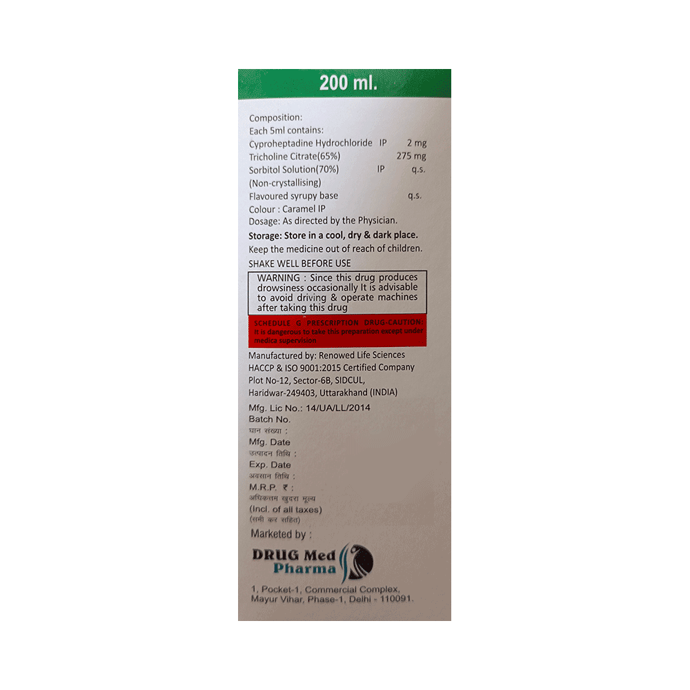 Salt Composition: Cyproheptadine (2mg/5ml) + Tricholine Citrate (275mg/5ml)