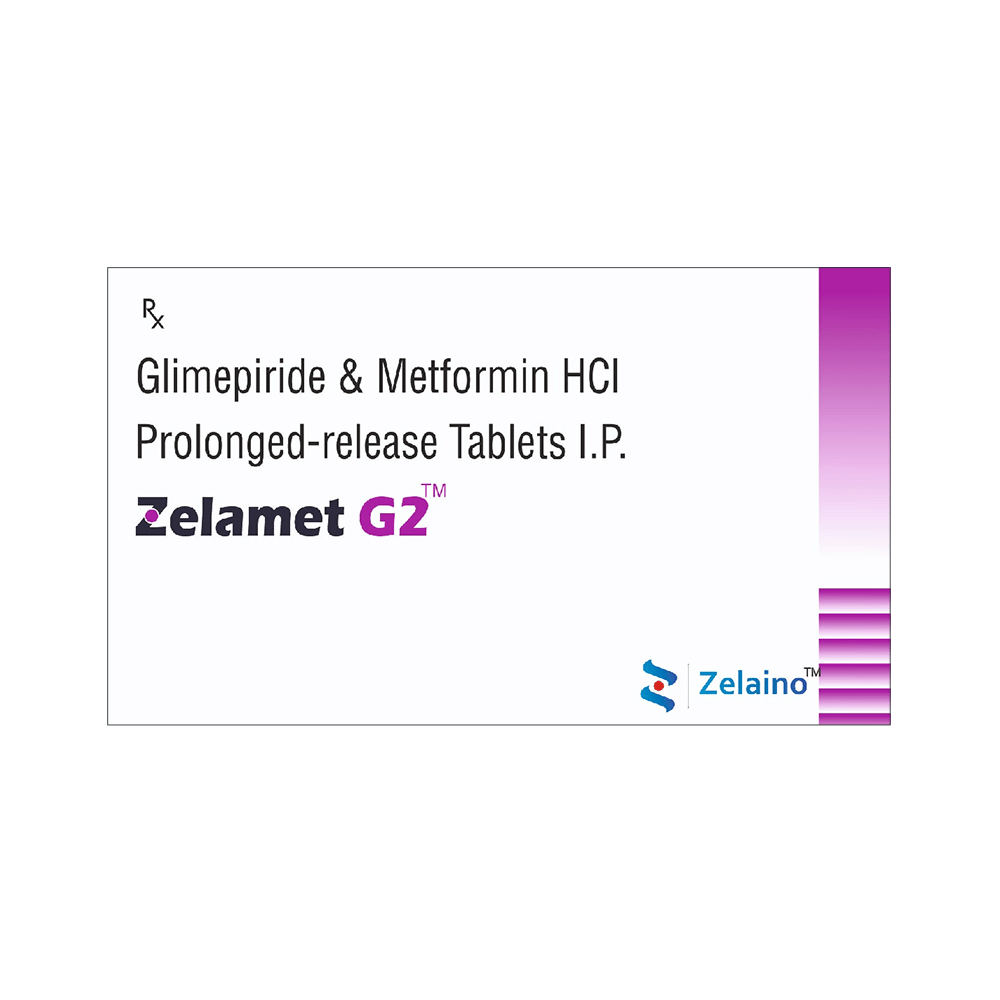 Zelamet G2 Tablet PR belongs to a category of medicines known as anti-diabetic drugs. It is a combination of two medicines used to treat type 2 diabetes mellitus in adults. It helps control blood sugar levels in people with diabetes. Zelamet G2 Tablet PR should be taken with food. Take it regularly at the same time each day to get the most benefit. Your doctor will decide what dose is best for you, and this may change from time to time according to how it is working, according to your blood sugar levels.Keep taking this medicine, even if you feel well or your blood sugar levels are controlled. If you stop it without consulting your doctor, your blood sugar levels could rise and put you at risk of kidney damage, blindness, nerve problems, and loss of limbs. Remember that it is only part of a treatment program that should also include a healthy diet, regular exercise, and weight reduction as advised by your doctor. Your lifestyle plays a big part in controlling diabetes.The most common side effect of Zelamet G2 Tablet PR is low blood glucose levels (hypoglycemia). Make sure you recognize the signs of having low blood glucose levels, such as sweating, dizziness, headache, and shaking, and know how to deal with them. To prevent this, it's important to have regular meals and always carry a fast-acting source of glucose, such as sugary food or fruit juice, with you. Drinking alcohol can also increase your risk of low blood sugar levels and should be avoided. Other side effects that may be seen on taking this medicine include taste changes, nausea, diarrhea, stomach pain, headache, and upper respiratory tract infection. Some people may find that they put on weight with this medicine.You should not take it if you have type 1 diabetes mellitus, diabetic ketoacidosis (high levels of acid in your blood), or severe kidney or liver disease. Before taking this medicine, tell your doctor if you have ever had heart disease. It may not be suitable. Pregnant or breastfeeding women should also consult their doctor before taking it. Your blood sugar levels should be checked regularly, and your doctor may also advise blood tests to monitor your blood cell counts and liver function.