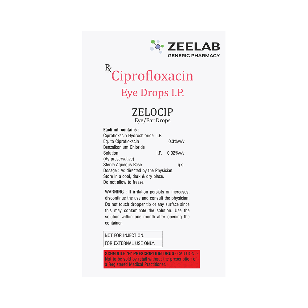 Zelocip Eye/Ear Drops is an antibiotic that is used to treat bacterial infections in the eyes or ears. It works by stopping the growth of bacteria, helping clear up infections like conjunctivitis (pink eye), corneal ulcers, or ear infections caused by bacteria. Use Zelocip Eye/Ear Drops exactly in the dose and duration advised by your doctor. Keep using it for the full course, even if you start feeling better, because stopping early can allow the infection to come back. Always wash your hands before and after using the drops. Avoid using contact lenses during treatment for an eye infection unless your doctor says it’s okay. Store the bottle properly, and don’t share it with others.Common side effects of Zelocip Eye/Ear Drops include mild eye discomfort, a feeling of grittiness, or redness in the eyes (also known as ocular hyperaemia). In some cases, temporary corneal deposits may form, especially with frequent use, but these usually clear up on their own. You might also notice a strange or bitter taste in your mouth after using the medicine—this is generally harmless. If any of these side effects become bothersome or don’t go away, consult your doctor.Do not use Zelocip Eye/Ear Drops if you are allergic to ciprofloxacin or any other quinolone antibiotics. If you are pregnant, breastfeeding, or have a history of ear surgery or serious medical conditions, let your doctor know before starting treatment. Avoid driving or using machinery if the drops temporarily blur your vision. Never use it for longer than prescribed, and don’t use it for conditions it wasn’t meant to treat.