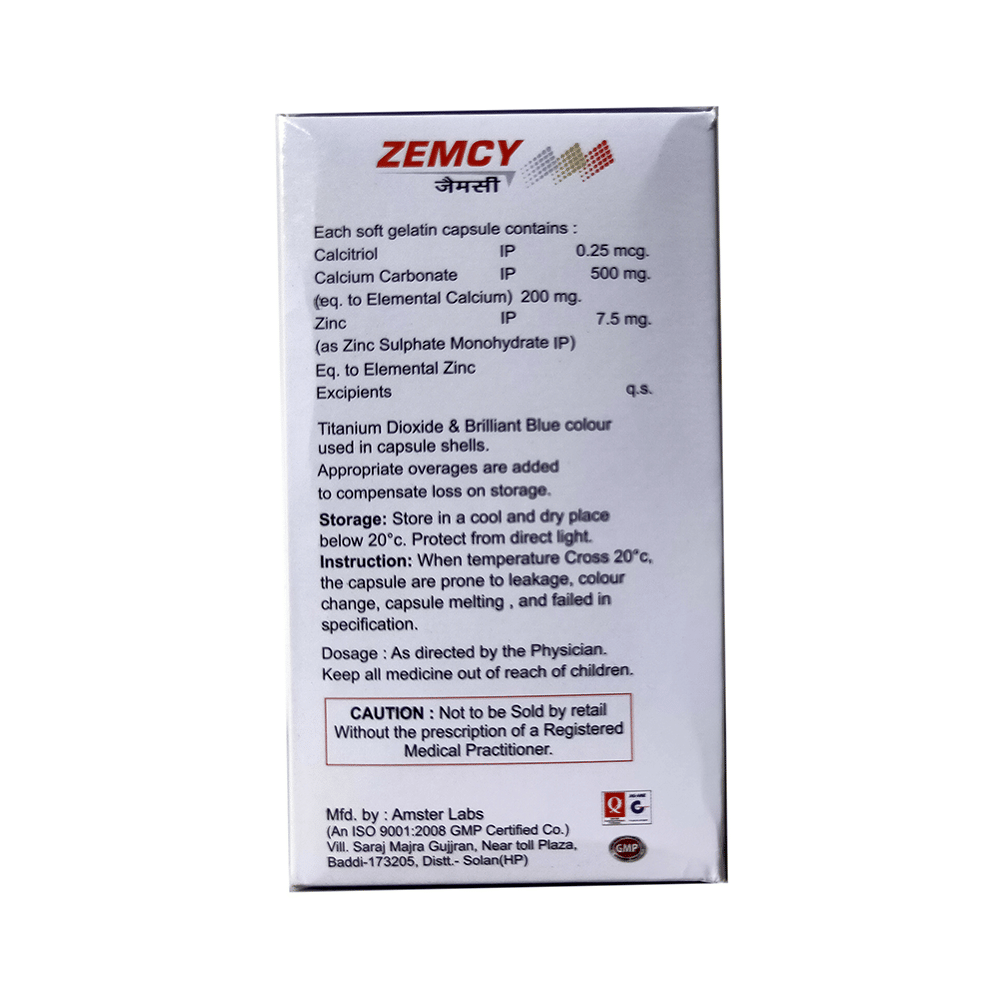 Zemcy Soft Gelatin Capsule is a combination of medicines that is used to treat nutritional deficiencies. It helps in the absorption of calcium and bone strengthening. It helps in proper growth and development of bones. It also helps in protein synthesis and the production of blood cells (red and white blood cells). Zemcy Soft Gelatin Capsule may be taken with or without food. It should be used in the dose and duration as prescribed by your doctor. It is advised to take this medicine at a fixed time.This medicine should not be taken more than the recommended dose. It is usually a safe medicine with very minimal or no side effects. However, if you experience severe diarrhea, vomiting, or constipation, you should consult your doctor without delay.Before taking this medicine, tell your doctor if you have any other health conditions. Inform your doctor if you are taking any other medicines or if you are pregnant or breastfeeding. It is advised not to take alcohol after taking this medicine.
