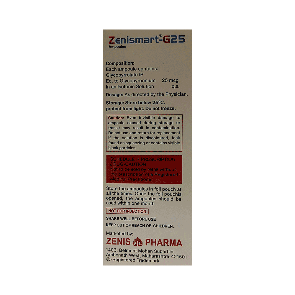 Zenismart-G25 Ampoules (2ml Each) is used to treat chronic obstructive pulmonary disease (COPD). This medicine helps the muscles around the lungs to stay relaxed and reduces symptoms like coughing, chest tightness, and shortness of breath. Your doctor will tell you how often you need to use Zenismart-G25 Ampoules (2ml Each). Take it in the dose and duration instructed by your doctor. The effect of this medicine may be noticeable after a few days but will only reach its maximum after a few weeks. This medicine must be used regularly to be effective, so continue using it even if you do not have any symptoms. If you stop taking it your symptoms of COPD may get worse. It should not be used to relieve sudden breathing problems.The most common side effects are upper respiratory tract infection, inflammation of the throat and nasal passage, breathlessness, and urinary tract infection. If any of these symptoms persist or worsen, talk to your doctor. They may be able to help by adjusting the dosage or by prescribing you an alternate medicine.Do not use this medicine if you have a known history of allergic reactions to any of the ingredients in this product. This medicine may not be suitable for everybody, let your doctor know if you have any preexisting medical conditions. Let your doctor also know about all the medicines you are taking. Pregnant and breastfeeding women should consult their doctors before using this medicine to make sure it is suitable for them.