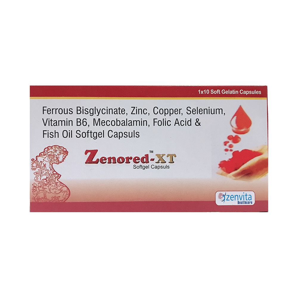 Zenored-XT Softgel Capsule is a combination of essential vitamins, minerals, and fatty acids used to manage nutritional deficiencies. Ferrous bisglycinate provides highly absorbable iron to support red blood cell production and oxygen transport. Folic acid and methylcobalamin aid in DNA synthesis and healthy nerve function, while vitamin B6 supports protein metabolism and neurotransmitter formation. Zinc, copper, and selenium act as antioxidants and support immune and enzymatic functions. Omega-3 fatty acids promote heart, brain, and cellular health. Together, these ingredients work synergistically to restore nutrient balance and support overall metabolic, neurological, and cardiovascular function.