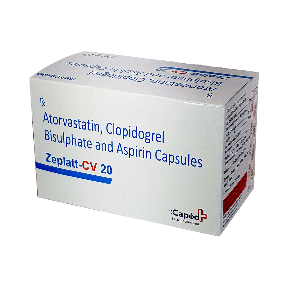 Zeplatt-CV 20 Capsule is a combination medicine used in the prevention of heart attack. It works by preventing clot formation in the blood vessels. It also helps to reduce increased cholesterol and triglyceride levels and promote cardiac health. Zeplatt-CV 20 Capsule may be taken with or without food. Take it regularly at evenly spaced intervals as per the schedule prescribed by your doctor. The prescribed dosage and length of treatment will vary based on your specific condition. Do not stop taking it until you have finished the complete course, even when you feel better. Lifestyle changes like a low-fat diet, exercise, and not smoking may help this medicine to work better.Bleeding is the most common side effect of Zeplatt-CV 20 Capsule. Other common side effects include abdominal pain, indigestion, headache, nausea, bruising, and nosebleeds. If any of these side effects persist or get worse, let your doctor know. They may be able to help find ways to treat or manage the side effects. Let your doctor know if you notice muscle symptoms (pain or weakness), yellowing of the skin, and dark urine.Zeplatt-CV 20 Capsule increases your risk of bleeding, so it is important to be careful while shaving, cutting nails, and using sharp objects. Avoid Zeplatt-CV 20 Capsule if you have bleeding issues, such as stomach ulcers, severe liver or kidney impairment, or blood-clotting disorders. Avoid alcohol intake while taking this medicine. Before taking this medicine, tell your doctor if you have any liver or kidney disease. Pregnant and breastfeeding women should inform their doctor before taking this medicine.