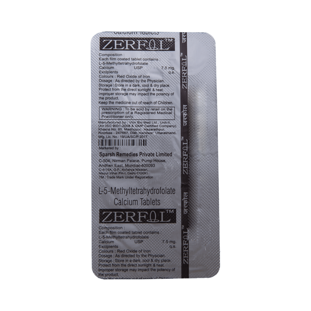 Zerfol Tablet is a form of folate (a type of vitamin B9) that your body can use directly, especially if you have trouble processing regular folic acid. Folate is important because it helps make healthy red blood cells and supports the production of DNA, the genetic material in all cells.