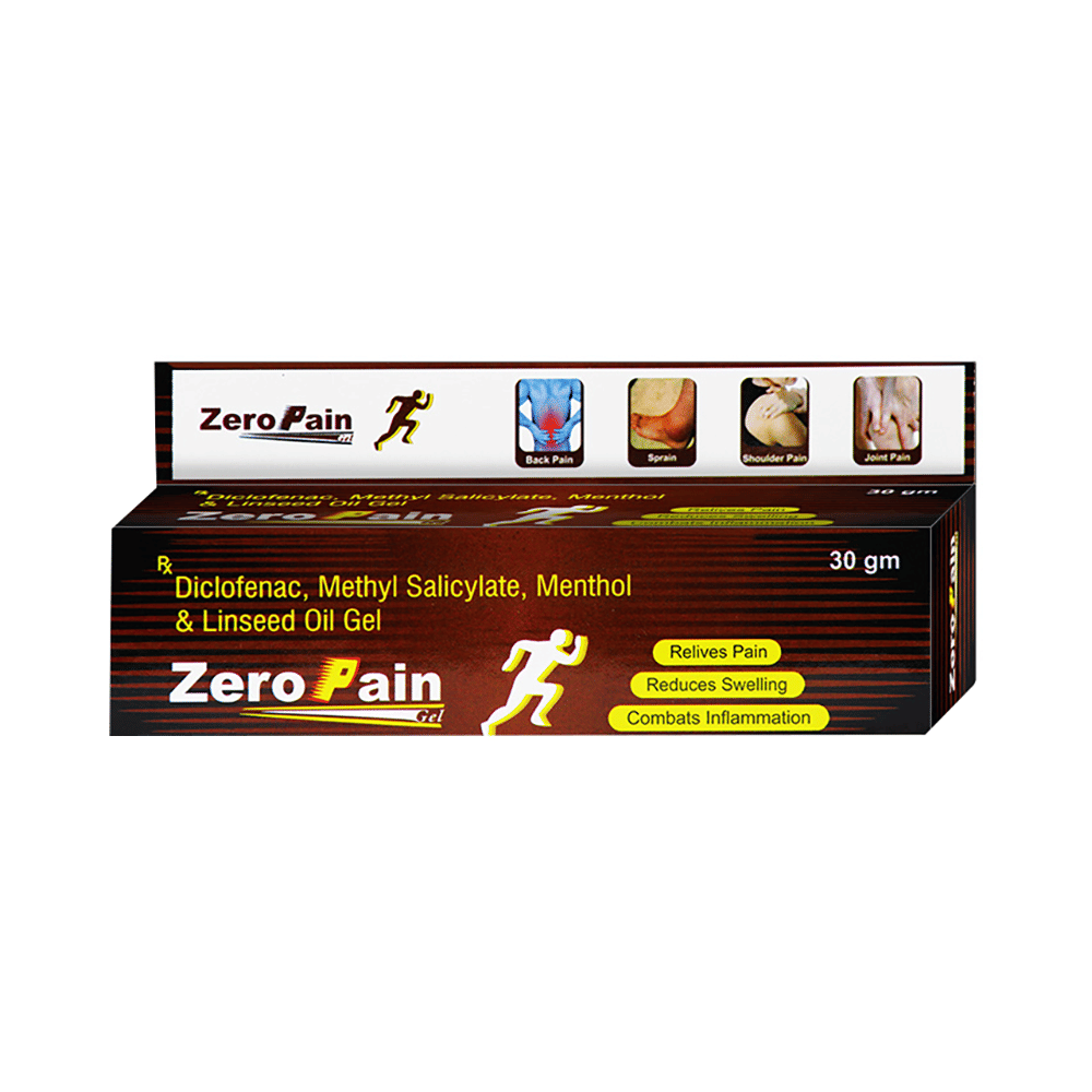 Zero Pain Gel is a combination of four medicines: Diclofenac diethylamine, Linseed Oil, Methyl Salicylate and Menthol. Diclofenac diethylamine and Menthol are non-steroidal anti-inflammatory drugs (NSAIDs) which work by blocking the release of certain chemical messengers that cause pain and inflammation (redness and swelling). Linseed Oil is a plant-based oil which further reduces inflammation and improves blood circulation at the site of application. It also increases the penetration of Diclofenac diethylamine through the skin. Methyl Salicylate produces a cooling effect on the skin.