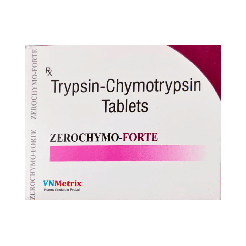 Zerochymo-Forte Tablet is a medicine used in the treatment of pain and inflammation (swelling). It helps relieve pain and swelling in postoperative wounds and other inflammatory diseases. Zerochymo-Forte Tablet can be taken with or without food. In general, you should try to use the smallest amount necessary to control your symptoms, for the shortest possible time. You should take this medicine regularly while you need it. Try not to miss doses, as this will make the medicine less effective.This medicine is generally well tolerated and does not usually cause any common side effects. However, in rare cases, it might cause an allergic reaction. Symptoms of an allergic reaction include itching, shortness of breath, swelling of the lips or throat, shock, and loss of consciousness. Occasionally, it may also cause gastric disturbances. If you experience any such symptoms, consult your doctor immediately.To make sure it is safe for you, before taking this medicine, let your doctor know if you have any medical conditions or disorders. You should also tell your doctor all the other medicines you are using or taking. Pregnant and breastfeeding women should consult their doctors before using this medicine.