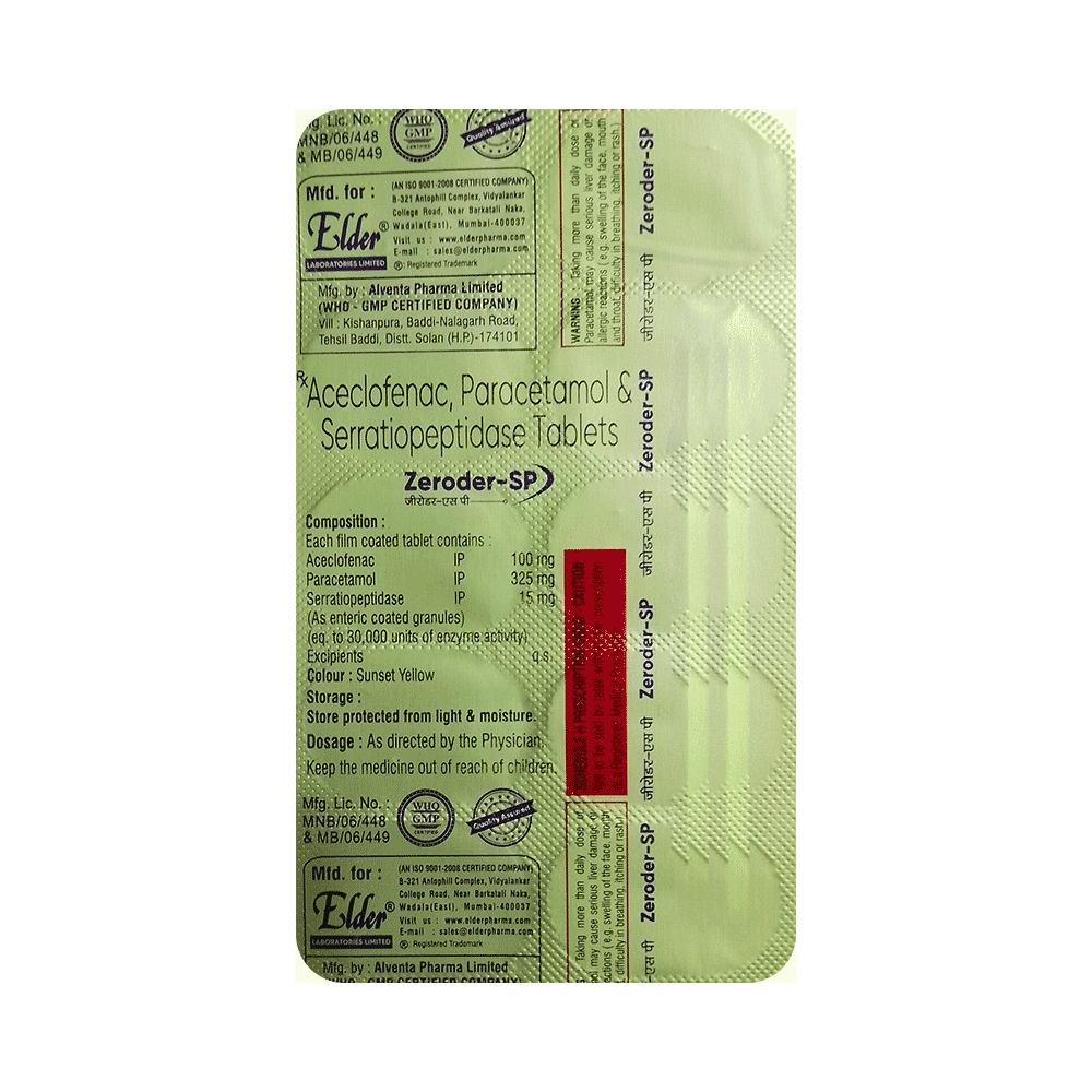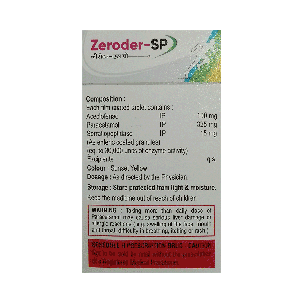 Zeroder-SP Tablet is a combination of three medicines: Aceclofenac, Paracetamol and Serratiopeptidase. Aceclofenac is a non-steroidal anti-inflammatory drug (NSAID), and Paracetamol is an antipyretic (fever reducer). They work by blocking the release of certain chemical messengers in the brain that cause pain and fever. Serratiopeptidase is an enzyme which works by breaking down abnormal proteins at the site of inflammation and promotes healing.