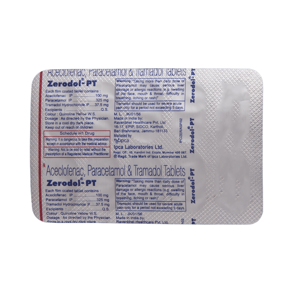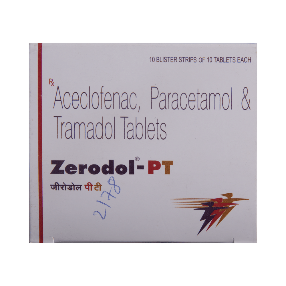 Zerodol PT Tablet is a combination of three medicines: Aceclofenac, Paracetamol and Tramadol. Paracetamol is an analgesic (pain reliever) as well as an antipyretic (fever reducer). Aceclofenac is a non-steroidal antiinflammatory drug (NSAID). Together, both of them work by blocking the release of certain chemical messengers in the brain that cause pain. Tramadol is an opioid analgesic ( very strong pain reliever) which works by blocking transmission of pain signals to the brain to lower the pain perception.