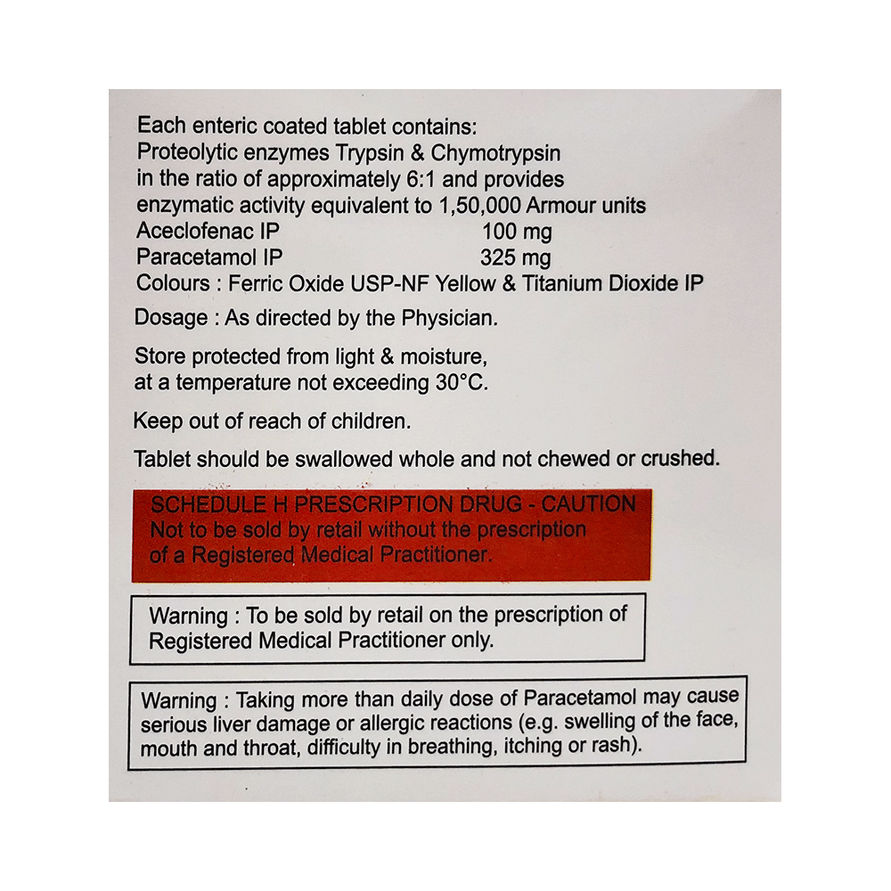Salt Composition: Aceclofenac (100mg) + Paracetamol (325mg) + Trypsin Chymotrypsin (150000AU)