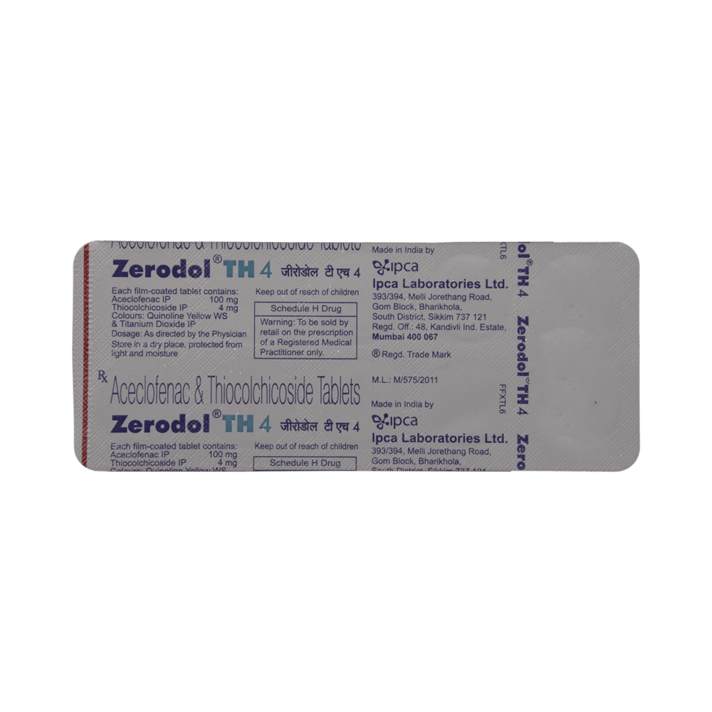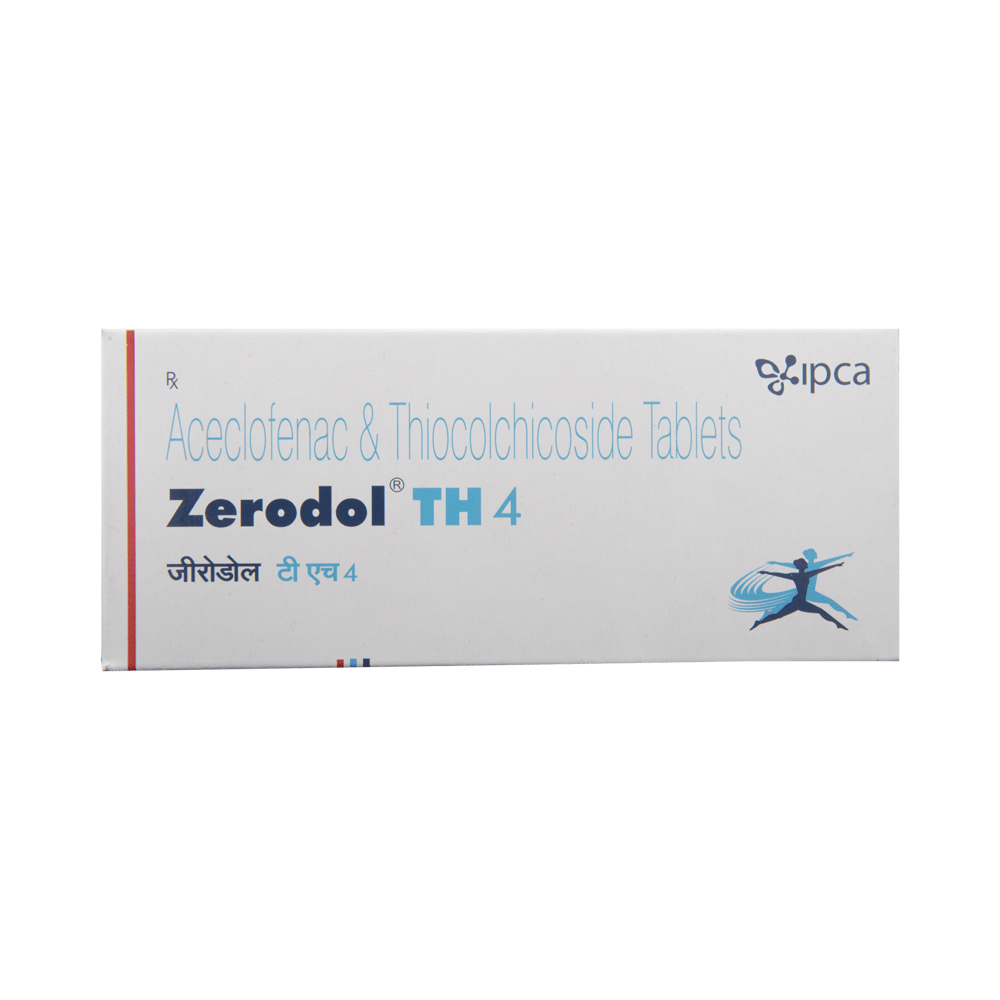 Zerodol TH 4 Tablet is a combination medicine used in the treatment of pain due to muscle spasms. It improves the movement of muscles and provides relief from pain and discomfort associated with muscle spasms. Zerodol TH 4 Tablet should be taken with food. This will prevent you from getting an upset stomach. You should take it regularly as advised by your doctor. Do not take more or use it for a longer duration than recommended by your doctor.Some of the common side effects of this medicine include nausea, vomiting, heartburn, stomach pain, loss of appetite, and diarrhea. If any of these side effects bother you or do not go away with time, you should let your doctor know. Your doctor may help with ways to reduce or prevent these side effects.The medicine may not be suitable for everybody. Before taking it, let your doctor know if you have any problems with your heart, kidneys, and liver. To make sure it is safe for you, let your doctor also know all the other medicines you are taking. Pregnant and breastfeeding mothers should first consult their doctors before using the medicine.
