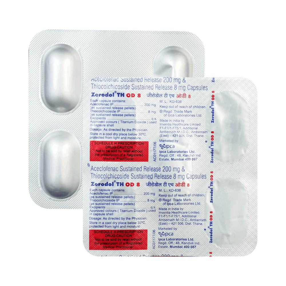 Zerodol TH OD 200 mg/8 mg Capsule SR is a combination medicine used in the treatment of pain due to muscle spasms. It improves the movement of muscles and provides relief from pain and discomfort associated with muscle spasms. Zerodol TH OD 200 mg/8 mg Capsule SR should be taken with food. This will prevent you from getting an upset stomach. You should take it regularly as advised by your doctor. Do not take more or use it for a longer duration than recommended by your doctor.Some of the common side effects of this medicine include nausea, vomiting, heartburn, stomach pain, loss of appetite, and diarrhea. If any of these side effects bother you or do not go away with time, you should let your doctor know. Your doctor may help with ways to reduce or prevent these side effects.The medicine may not be suitable for everybody. Before taking it, let your doctor know if you have any problems with your heart, kidneys, and liver. To make sure it is safe for you, let your doctor also know all the other medicines you are taking. Pregnant and breastfeeding mothers should first consult their doctors before using the medicine.
