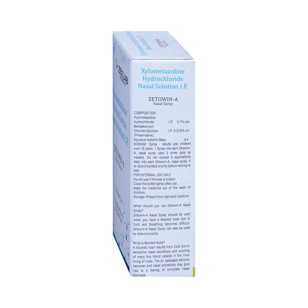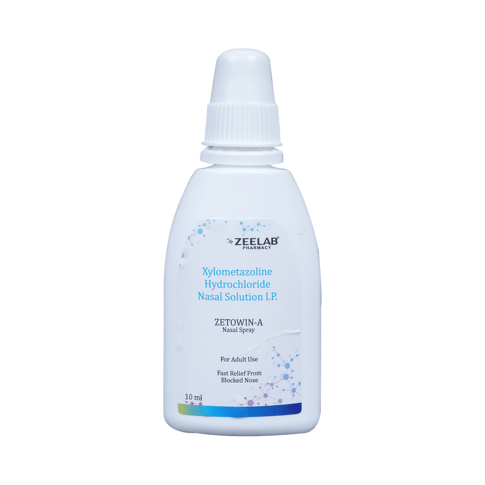 Zetowin-A Nasal Solution is a medicine used to treat nasal congestion (blocked nose) caused by the common cold or flu, hay fever, and other allergies. It shrinks blood vessels in your nose to relieve nasal congestion and blockage. Zetowin-A Nasal Solution should be used as you have been advised by your doctor. It provides only temporary relief so do not use it more often or for longer than recommended. Normally you should blow your nose gently before using it, keep one nostril closed while applying the medicine into the other, and then sniff hard to make sure it reaches deep into the nose. Then repeat for the other nostril. It provides relief very quickly and can last for several hours. If you use this medicine too often or for too long, it may worsen your symptoms rather than improve them.The most common side effects are burning sensation in the nose and throat, local irritation, nausea, headache, and dry nose. These are usually mild but if they bother you or do not go away, your doctor may be able to suggest ways of preventing or reducing them.It is generally a safe medicine but, before taking it, talk to your doctor about any health problems you have such as heart problems or high blood pressure (hypertension) or overactive thyroid gland or glaucoma, or prostate enlargement. Let your doctor know about any other medicines you are taking to make sure you are safe. Ask your doctor for advice before using this medicine if you are pregnant or breastfeeding.