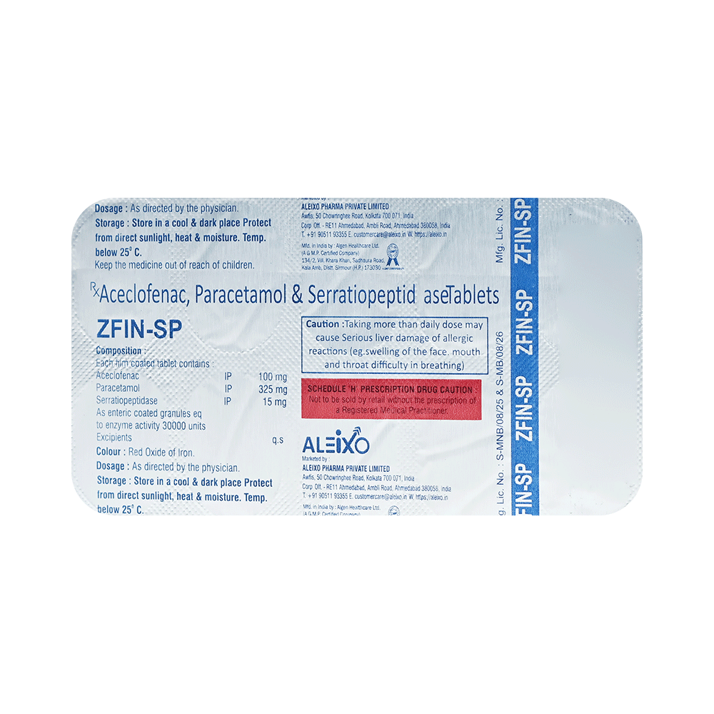 Zfin-SP Tablet is a combination of three medicines: Aceclofenac, Paracetamol and Serratiopeptidase. Aceclofenac is a non-steroidal anti-inflammatory drug (NSAID), and Paracetamol is an antipyretic (fever reducer). They work by blocking the release of certain chemical messengers in the brain that cause pain and fever. Serratiopeptidase is an enzyme which works by breaking down abnormal proteins at the site of inflammation and promotes healing.