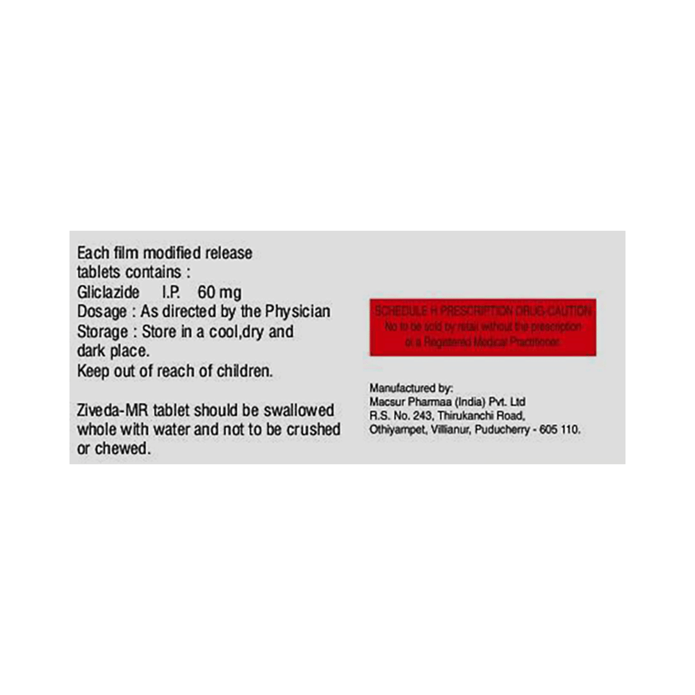 Zideva-XR Tablet is a medicine used to treat type 2 diabetes mellitus in adults. It belongs to a group of medicines called sulfonylureas and helps control blood sugar levels in people with diabetes. This helps prevent serious complications of diabetes. Zideva-XR Tablet may be prescribed alone or along with other medicines. It should be taken with food. Take it regularly at the same time each day to get the most benefit. Your doctor will decide what dose is best for you, which may change from time to time according to how it works. Continue using this medicine as prescribed, even if you feel fine or your blood sugar levels are stable. If you stop it without consulting your doctor, your blood sugar levels could rise and put you at risk of kidney damage, blindness, and nerve problems.Keep in mind that this medicine is just one part of your treatment plan. It should be combined with a healthy diet, regular exercise, and weight management as recommended by your doctor. Your lifestyle plays a crucial role in managing diabetes.The most common side effects of taking this medicine include diarrhea and headaches. It can also cause low blood glucose levels (hypoglycemia). Make sure you recognize the signs of having low blood glucose levels, such as sweating, dizziness, headache, and shaking. You must know how to deal with it.To prevent hypoglycemic conditions, have regular meals and always carry a fast-acting source of glucose, such as sugary food or fruit juice, with you. Consuming alcohol can raise the risk of low blood sugar and should be avoided. Additionally, some individuals may experience weight gain while taking this medicine. You should not take Zideva-XR Tablet if you have type 1 diabetes mellitus, diabetic ketoacidosis (high levels of acid in your blood), or severe kidney or liver disease.Before taking this medicine, tell your doctor if you have ever had heart disease, thyroid disease, or some hormonal conditions. It may not be suitable. Pregnant or breastfeeding women should also consult their doctor before taking it. Regularly monitor your blood sugar levels, and your doctor may recommend blood tests to check your blood cell counts and liver function.