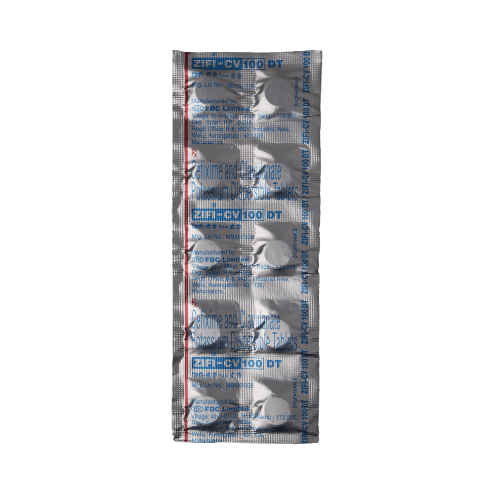 Zifi CV 100 DT Tablet is a combination medicine. It is prescribed to treat various types of bacterial infections. It fights against the microorganisms to prevent their growth and further spread of the infection. Zifi CV 100 DT Tablet is a prescription medicine. It is advised to take it as per the prescription. It can be taken with or without food, but it must be taken at a fixed time to ensure better efficacy. Do not consume more than the recommended dose, as this may have harmful effects on your body. If you miss a dose, take it as soon as you remember. The course of the treatment must be completed even if you feel better. Sudden discontinuation of the treatment may affect the potency of the medicine.Some common side effects of this medicine include nausea, vomiting, diarrhea, indigestion, and bloating. If any of the side effects get aggravated, you must consult your doctor immediately. If you experience any allergic reaction (rashes, itching, swelling, shortness of breath, etc.), you must seek immediate medical help.Before taking this medicine, you should tell your doctor if you are taking any medicines for any health condition. Pregnant or breastfeeding women should also consult with their doctor before taking it. Avoid drinking alcohol as it can cause excessive drowsiness with this medicine. It usually does not impair your ability to drive, but you should not drive if it makes you feel sleepy or dizzy. You must take adequate rest for a faster recovery, also take a healthy diet and drink plenty of water. Your doctor may ask for a few laboratory and diagnostic tests to know the effects of the medicine on your body.
