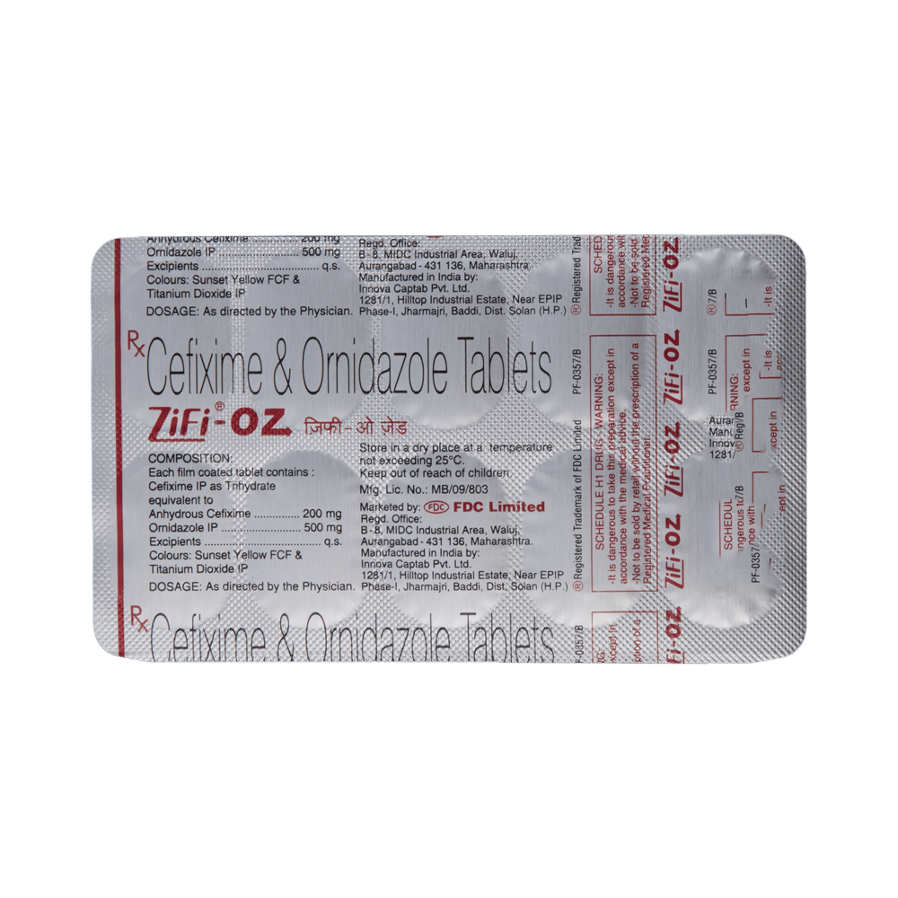 Zifi OZ Tablet is a combination of two antibiotics: Cefixime and Ornidazole. Cefixime works by preventing the formation of the bacterial protective covering which is essential for the survival of bacteria in the human body. Ornidazole kills other infectious microorganisms in addition to bacteria by damaging their DNA. Together, they treat your infection effectively.