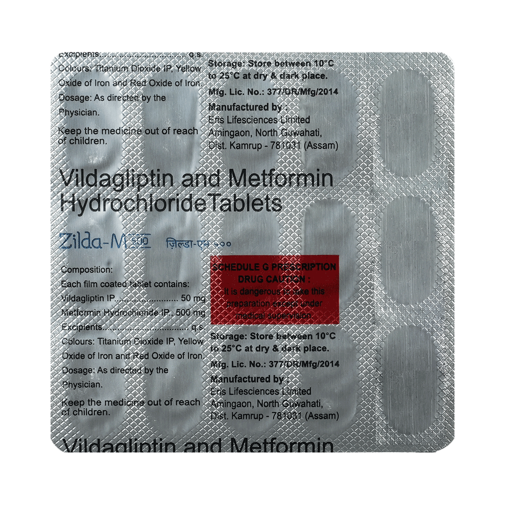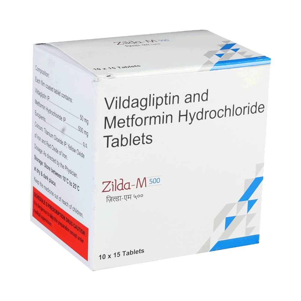 Zilda M 500mg/50mg Tablet is a combination of two medicines that control high blood sugar levels in people with type 2 diabetes mellitus. This helps prevent serious complications of diabetes, such as kidney damage and blindness, and may also reduce your chances of having a heart attack or stroke. Zilda M 500mg/50mg Tablet can be prescribed alone or together with other diabetes medications. All diabetes medicines work best when used along with a healthy diet and regular exercise. The dose you are given will depend on your condition, blood sugar levels, and what other medicines you are taking. Taking it with meals helps reduce the chances of developing an upset stomach. You should take it regularly, at the same time each day, to get the most benefit, and you should not stop unless your doctor recommends it. It controls your blood sugar levels and helps prevent serious complications in the future. It is important to stay on the diet and exercise program recommended by your doctor while taking this medicine. Your lifestyle plays a big part in controlling diabetes.The most common side effects of taking this medicine include nausea, headache, and gastroesophageal reflux disease. Low blood sugar level (hypoglycemia) is also a possible side effect if you are also taking other diabetes medicines like insulin or sulfonylurea, so you need to know how to recognize and deal with it.This medicine is not suitable for everyone. Before taking it, you should let your doctor know if you have ever had kidney, liver, or heart disease; problems with your pancreas; or if you drink a lot of alcohol. Pregnant or breastfeeding women should also consult their doctor before taking this medicine. Some other medicines can affect this one, so tell your doctor about all the medicines you are taking to make sure Zilda M 500mg/50mg Tablet is safe. You should try to avoid drinking alcohol, as it lowers blood glucose. Your doctor will check your kidney function and blood sugar levels before and during treatment.