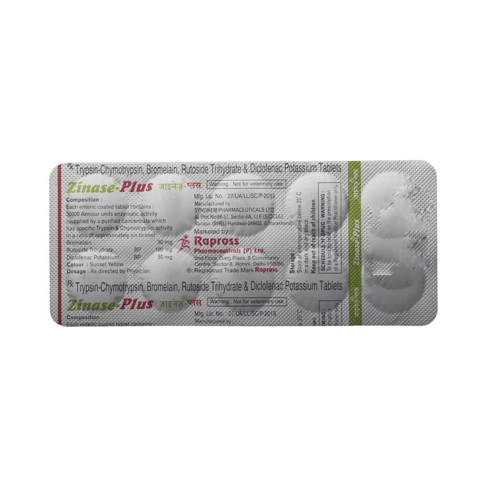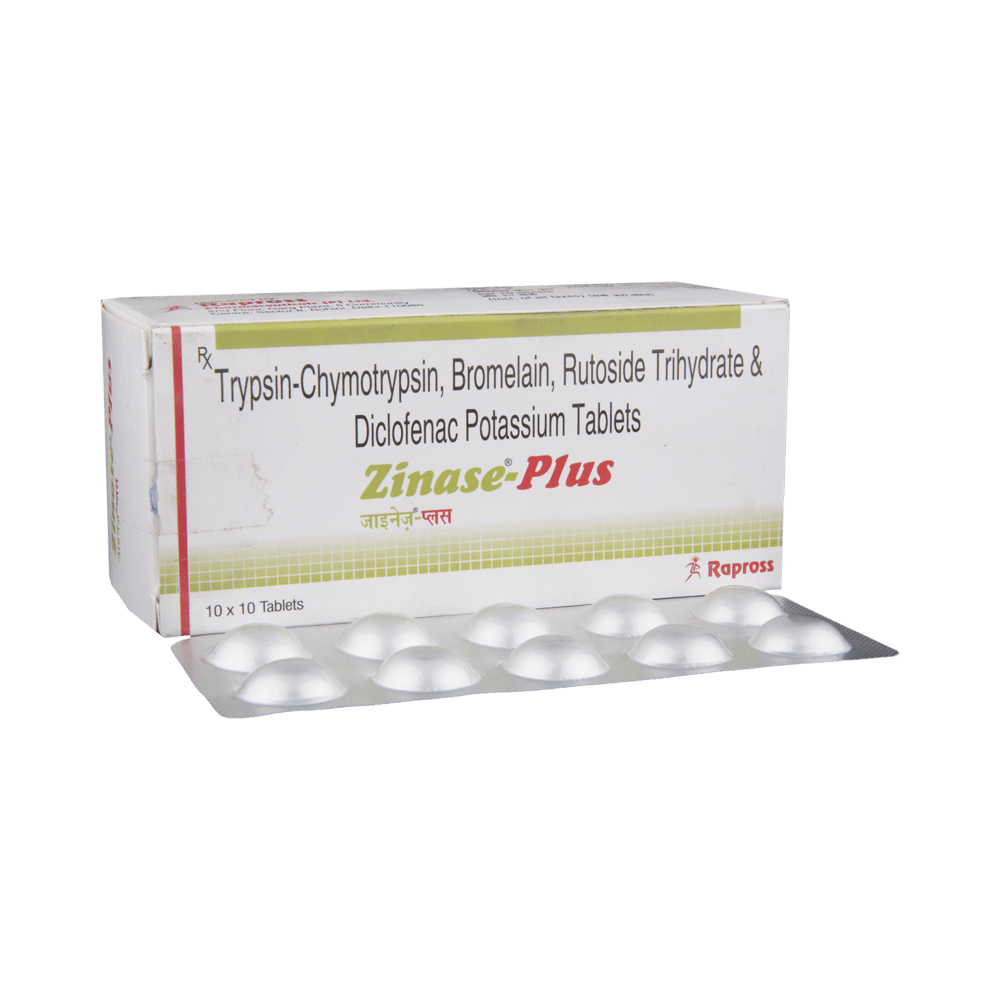 Zinase-Plus Tablet is a combination of four medicines: Bromelain, Diclofenac, Rutoside and Trypsin Chymotrypsin. Bromelain and Trypsin Chymotrypsin are enzymes. They increase blood supply and make the body produce substances that fight pain and swelling. Diclofenac is a non-steroidal antiinflammatory drug (NSAID) which works by blocking the release of certain chemical messengers (prostaglandins) in the brain that cause pain and inflammation (redness and swelling). Rutoside is an antioxidant which protects the body from damage by chemicals (free radicals) and further reduces swelling.