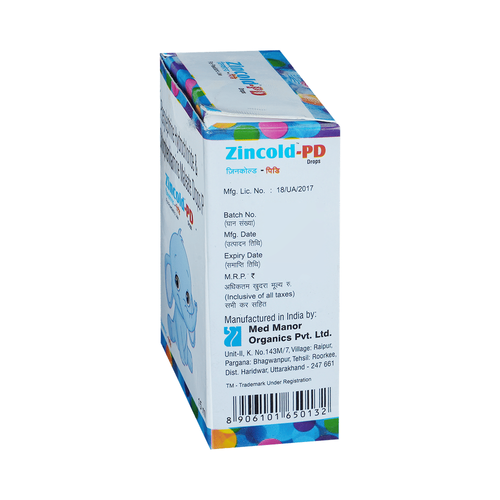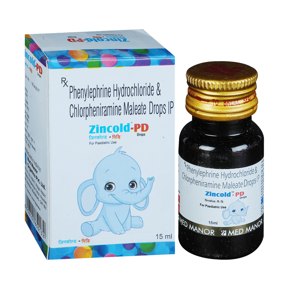 Zincold PD Oral Drops is a combination medicine used for the symptomatic treatment of common cold in children. It helps relieve discomfort caused by a runny nose, blocked nose, and sneezing, allowing the child to breathe more easily and feel better. Zincold PD Oral Drops may be given to your child with or without food. Always follow the exact dose and duration prescribed by the doctor. The dosage will depend on your child’s age, weight, and the severity of symptoms. Do not stop the medicine early, even if your child seems to be feeling better, unless advised by the doctor.Common side effects may include nausea, vomiting, or headache. These are usually mild and temporary. However, if you notice anything unusual or are concerned about how your child is responding to the medicine, consult your doctor promptly. This medicine may also cause drowsiness, so avoid engaging your child in activities that require alertness until you know how it affects them.Make sure your child stays well hydrated while taking Zincold PD Oral Drops. Inform your doctor if your child has any history of liver or kidney problems, as the dose may need to be adjusted accordingly.Note: As per the Ministry of Health and Family Welfare, Zincold PD Oral Drops should not be used in children below 4 years of age.