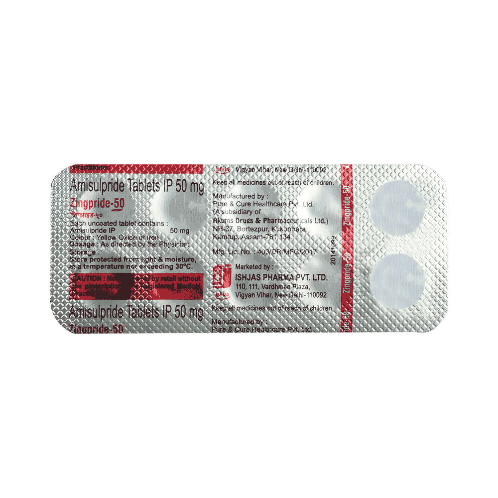 Zingpride 50mg Tablet is a prescription medicine used in the treatment of schizophrenia, a mental disorder that can result in hallucinations or delusions and also adversely affects a person’s ability to think and behave. Zingpride 50mg Tablet may be taken with or without food, preferably before bedtime. However, it is advised to take it at the same time each day as this helps to maintain a consistent level of medicine in the body. Take this medicine in the dose and duration as advised by your doctor and if you have missed a dose, take it as soon as you remember. Do not skip any doses and finish the full course of treatment even if you feel better. It is important that this medication is not stopped suddenly without talking to your doctor as it may worsen your symptoms.Some common side effects of this medicine include nausea, vomiting, dryness in the mouth, blurred vision, insomnia, and erectile dysfunction. Initially, this medicine may cause a sudden drop in blood pressure when you change positions, so it is better to rise slowly if you have been sitting or lying down. It also causes dizziness and sleepiness, so do not drive or do anything that requires mental focus until you know how this medicine affects you. This medicine can lead to weight gain and may increase your blood sugar and cholesterol levels. However, modifying your lifestyle by having a healthy diet and exercising regularly can reduce this side effect.