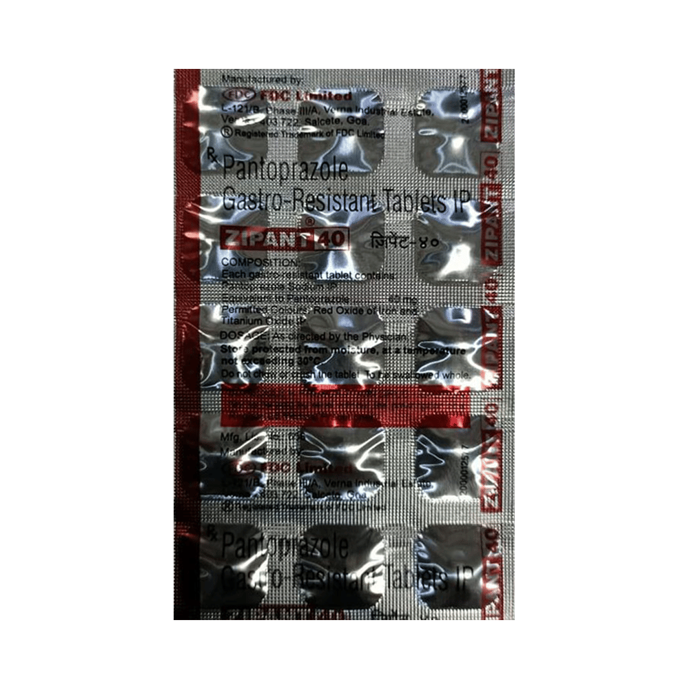 Zipant 40 Tablet is a medicine that reduces the amount of acid produced in your stomach. It is used for treating acid-related diseases of the stomach and intestine such as heartburn, acid reflux, peptic ulcer disease, and Zollinger-Ellison syndrome. It provides relief from the symptoms and promotes healing. Zipant 40 Tablet is also used to prevent stomach ulcers and acidity that may be seen with the prolonged use of painkillers. It belongs to a class of medicines known as proton pump inhibitors (PPIs). This medicine should be taken one hour before a meal, preferably in the morning. The dose will depend on your underlying condition and how you respond to the medicine. You should keep on taking it as prescribed even if your symptoms disappear quickly. You can increase the efficiency of the treatment by eating smaller meals more often and avoiding caffeinated drinks (like tea and coffee), and spicy or fatty foods.The most common side effects observed with this medicine include nausea, vomiting, headache, dizziness, flatulence, diarrhea, and stomach pain. These symptoms are generally mild but if they bother you or do not go away, consult your doctor. Long-term use of this medicine may lead to an increased risk of side effects. For instance, using this medicine for more than 1 year may increase your risk for bone fractures, especially with higher doses. Talk to your doctor about ways to prevent bone loss (osteoporosis), like taking calcium and vitamin D supplements.Before taking this medicine, you need to tell your doctor if you have severe liver problems, are taking medicines for HIV, have ever had an allergic reaction to similar medicines in the past, or suffer from bone loss (osteoporosis). Pregnant or breastfeeding women should also consult their doctor before taking it.