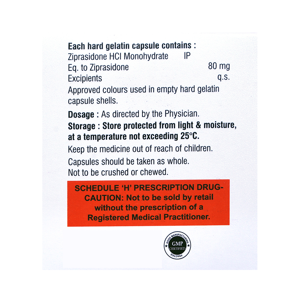 Zipratic 80 Capsule is used in the treatment of schizophrenia (a mental disorder that can result in hallucinations or delusions and also adversely affects a person’s ability to think and behave) and mania. Zipratic 80 Capsule should be taken with food, preferably at the same time, each day. Take this in the dose and duration as advised by your doctor and if you have missed a dose, take it as soon as you remember. It is important that this medication is not stopped suddenly without talking to your doctor as it may worsen your symptoms. However, discontinue this medicine immediately if you experience Neuroleptic malignant syndrome (NMS), characterized by fever, muscle rigidity, and altered consciousness or seizures.Some common side effects of this medicine include headache, nausea, vomiting, abnormal vision, and dystonia (involuntary muscle contractions). Initially, this medicine may cause a sudden drop in blood pressure when you change positions, so it is better to rise slowly if you have been sitting or lying down. It also causes dizziness and sleepiness, so do not drive or do anything that requires mental focus until you know how this medicine affects you. This medicine may increase your weight but, modifying your lifestyle by having a healthy diet and exercising regularly can reduce this side effect.You should be cautious while using this medicine as it may increase the risk of developing diabetes, so it is better to monitor glucose regularly. Inform your doctor if you develop any unusual changes in mood or behavior, new or worsening depression, or suicidal thoughts while taking this medicine.