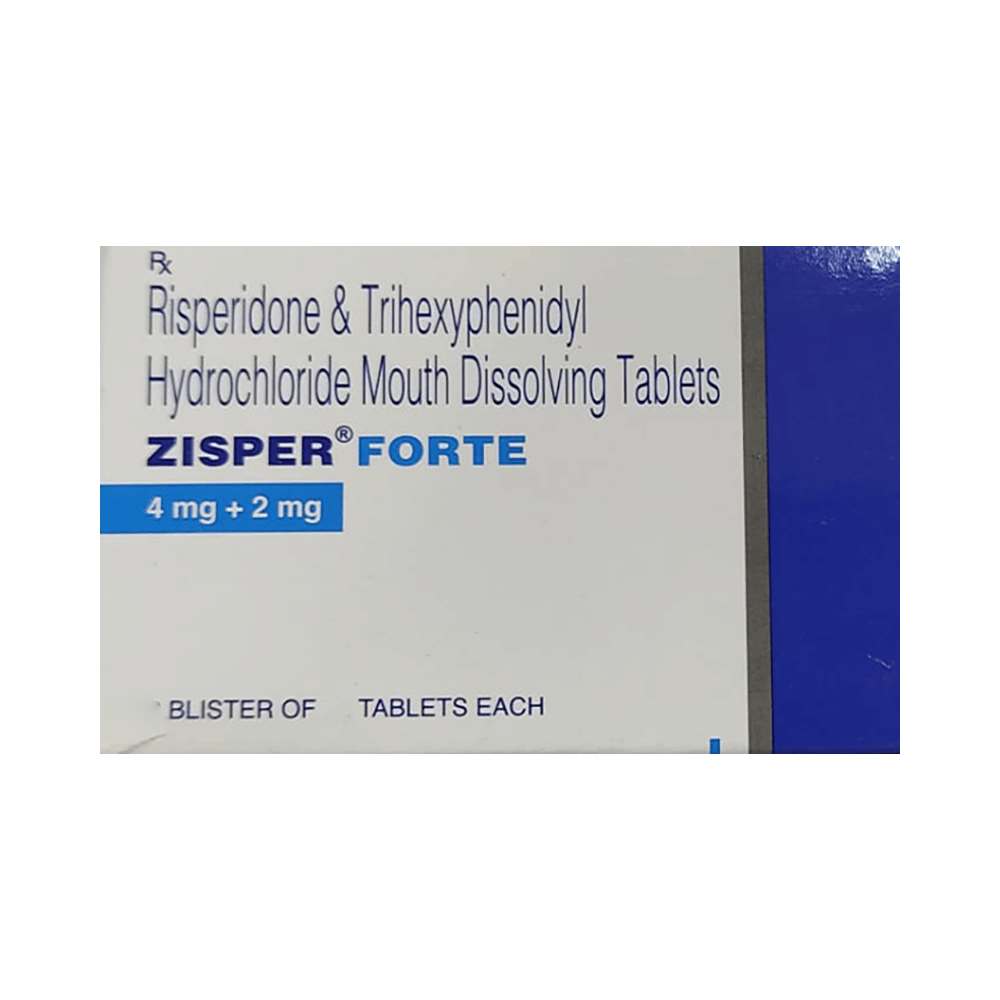 ZISPer Forte Tablet is a combination medicine used in the treatment of schizophrenia. It works by modulating the action of certain chemical messengers in the brain that affect thoughts. ZISPer Forte Tablet is taken with or without food, preferably at night. However, it is advised to take it at the same time each day, as this helps maintain a consistent level of medicine in the body. Take this in the dose and duration advised by your doctor. If you miss a dose of this medicine, take it as soon as you remember. It is important not to stop this medicine suddenly without talking to the doctor, as it may worsen your symptoms.Some common side effects of this medicine include nausea, constipation, upper respiratory tract infection, urinary tract infection, tremor, blurred vision, and dryness in the mouth. Initially, this medicine may cause a sudden drop in blood pressure when you change positions, so it is better to rise slowly if you have been sitting or lying down. It also causes dizziness and sleepiness. So, do not drive or do anything that requires mental focus until you know how this medicine affects you. This medicine may increase your weight, blood sugar, and cholesterol, but modifying your lifestyle by having a healthy diet and exercising regularly can reduce these side effects.Your doctor should also know about all other medicines you are taking, as many of these may make this medicine less effective or change the way it works. Inform your doctor if you are pregnant, planning pregnancy, or breastfeeding.