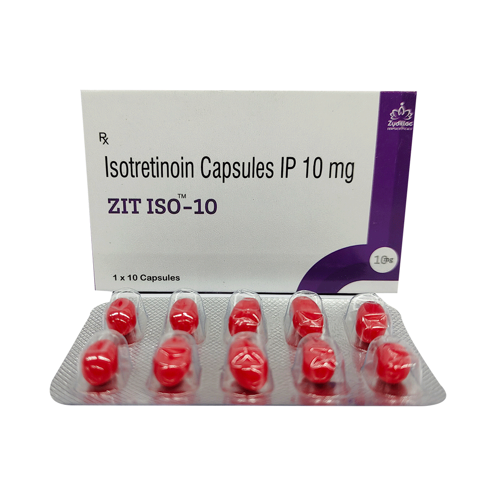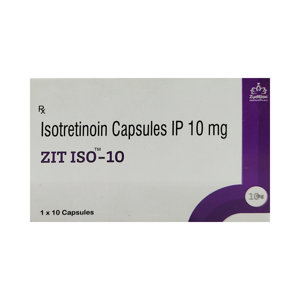 Zit Iso 10 Capsule belongs to a group of medicines called retinoids (vitamin A derivative). It is used to treat severe acne that has not responded to other treatments. Zit Iso 10 Capsule should be used in the dose and duration as advised by your doctor. Take it with food, preferably at the same time each day to avoid a missed dose. It may take several weeks for your symptoms to improve but keep taking the medicine regularly to get the most benefit. If you notice no improvement after a few weeks, see your doctor again.The most common side effects include dry skin, rash, and increased liver enzymes. They are not usually serious and often disappear after getting used to the medicine but if they bother you or do not go away, tell your doctor.Zit Iso 10 Capsule may make you more sensitive to sunlight so you should limit your exposure to the sun. It may also make your skin more fragile. Avoid any waxing (hair removal), or laser treatments during treatment. Additionally, it may cause dryness of the mouth, lips, and eyes so drink plenty of water and use a moisturizer. This medicine may lead to birth defects, do consult your doctor if you are pregnant or planning pregnancy.
