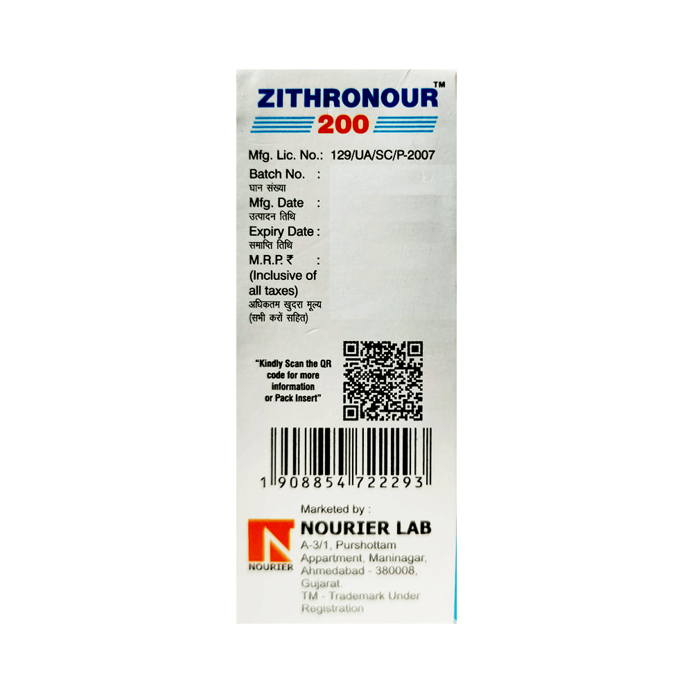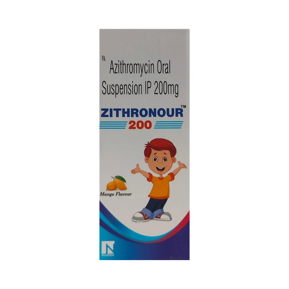 Zithronour 200 Oral Suspension Mango is an antibiotic used to treat various types of bacterial infections of the respiratory tract, ear, nose, throat, lungs, skin, and eye in adults and children. It is also effective in typhoid fever and some sexually transmitted diseases like gonorrhea. Zithronour 200 Oral Suspension Mango can be taken with or without food. Take it regularly and at a fixed time. Do not skip any doses and finish the full course of treatment even if you feel better. Stopping the medicine too early may lead to the return or worsening of the infection.Common side effects seen with Zithronour 200 Oral Suspension Mango include diarrhea, vomiting, nausea, and stomach pain. These are usually temporary and subside with the completion of treatment. Consult your doctor if you find these side effects worry you or persist for a longer duration.Do not use Zithronour 200 Oral Suspension Mango if you have a history of cholestatic jaundice or hepatic dysfunction that can be worsened with the use of Zithronour 200 Oral Suspension Mango. Inform your doctor if you have any previous history of allergy or heart problems before taking this medicine. Pregnant or breastfeeding women should consult their doctor before using this medicine.