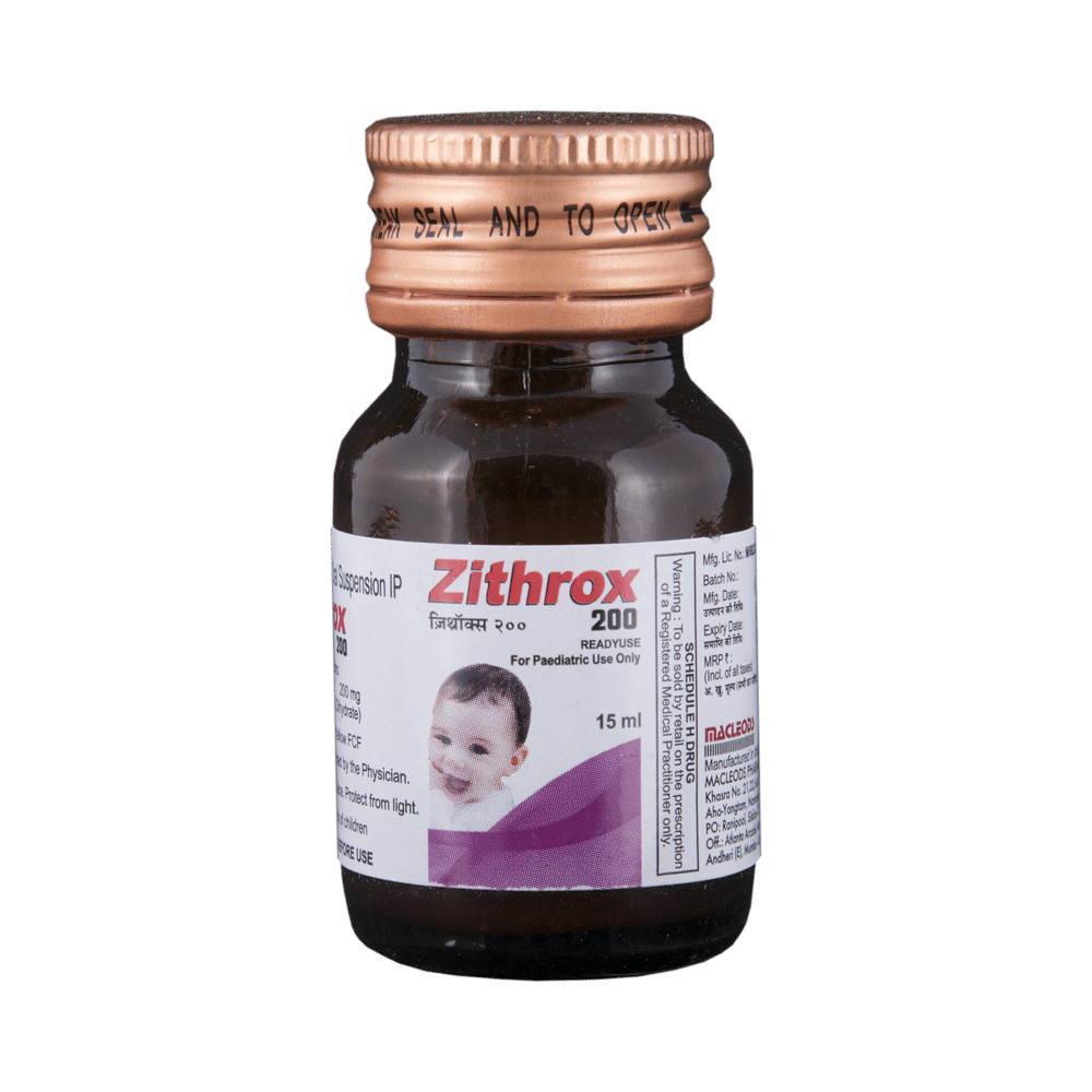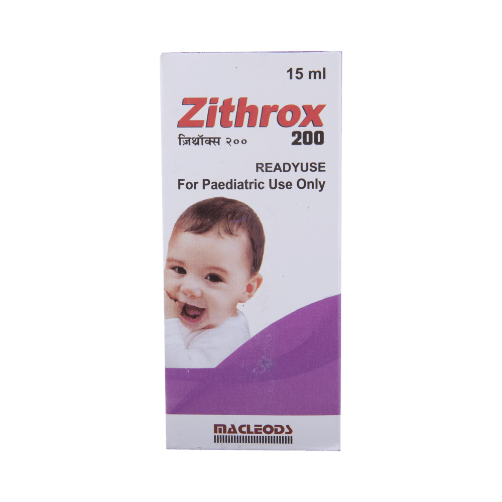 Zithrox 200 Readyuse Suspension is an antibiotic medication. It is commonly given to children for the treatment of a wide range of bacterial infections targeting the ear, eyes, nose, throat, lungs, skin, and gastrointestinal tract. Zithrox 200 Readyuse Suspension works by inhibiting the growth of the infection-causing bacteria and stopping it from multiplying. As a result of this, the spread of the infection is disabled. Zithrox 200 Readyuse Suspension is usually given once a day, preferably in the morning. However, in the case of typhoid, it is to be given twice. Give it with or without food at about the same time each day. However, it is best given with food since children often have a sensitive stomach and could easily get a stomach upset.Medicine dose depends on the type of infection your child has, its severity, and your child’s age and body weight. So stick to the dose, time, and way prescribed by the doctor. In case your child vomits within 30 minutes of taking this medicine, give the same dose again.Your child may start to feel better within 2 days of regular dosing. However, you must still complete the full prescribed course of the medicine and never stop it abruptly as that may worsen your child’s condition or increase the risk of reinfection. Some of the minor and temporary side effects of this medicine include vomiting, diarrhea, nausea, and stomach pain. Usually, these episodes subside once your child’s body adapts to the medicine. However, in case these effects persist or become bothersome for your child, consult your child’s doctor without any delay.Inform your child’s doctor about any previous episode of any allergy, heart problem, liver impairment, and kidney malfunction. Knowing the child’s medical history is critical for dose alterations and for planning your child’s overall treatment.