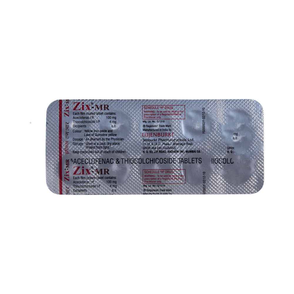 Zix-MR Tablet is a combination medicine used in the treatment of pain due to muscle spasms. It improves the movement of muscles and provides relief from pain and discomfort associated with muscle spasms. Zix-MR Tablet should be taken with food. This will prevent you from getting an upset stomach. You should take it regularly as advised by your doctor. Do not take more or use it for a longer duration than recommended by your doctor.Some of the common side effects of this medicine include nausea, vomiting, heartburn, stomach pain, loss of appetite, and diarrhea. If any of these side effects bother you or do not go away with time, you should let your doctor know. Your doctor may help with ways to reduce or prevent these side effects.The medicine may not be suitable for everybody. Before taking it, let your doctor know if you have any problems with your heart, kidneys, and liver. To make sure it is safe for you, let your doctor also know all the other medicines you are taking. Pregnant and breastfeeding mothers should first consult their doctors before using the medicine.