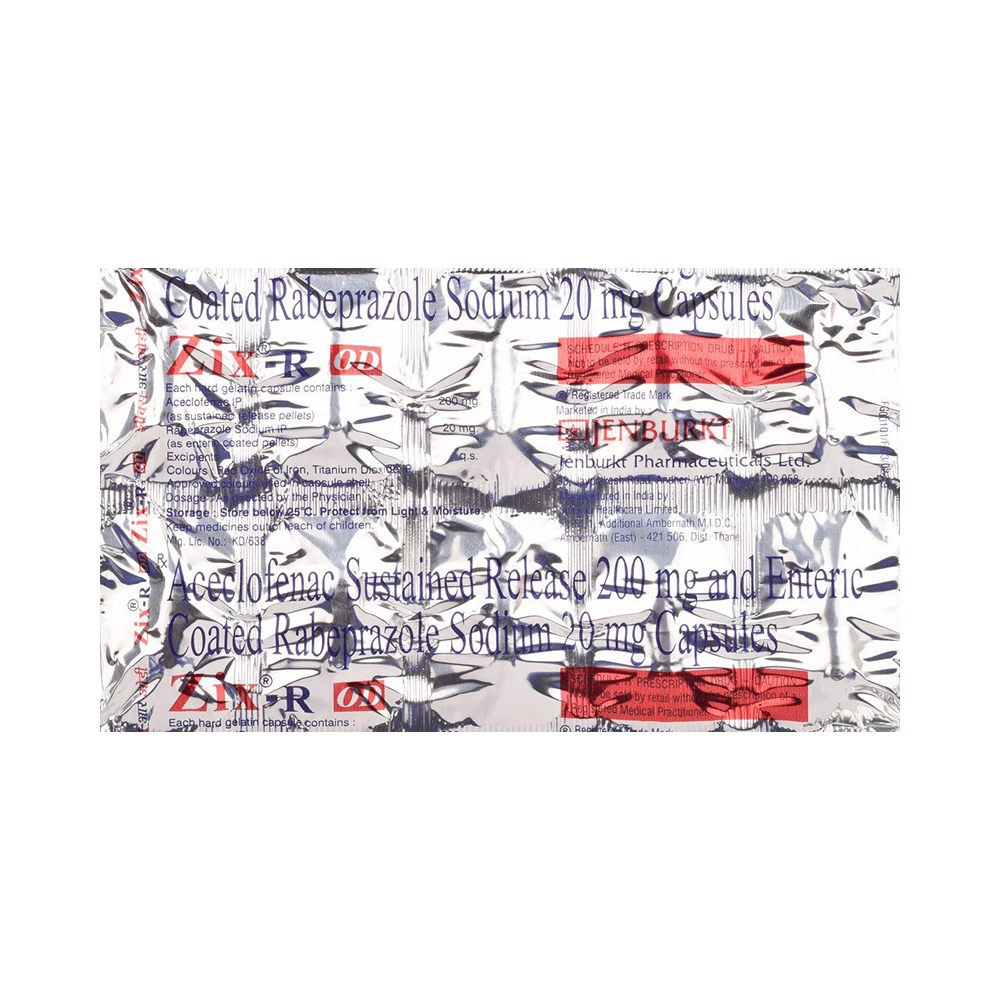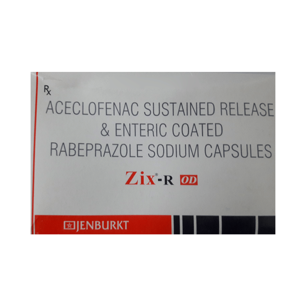 Zix-R OD Capsule SR is a combination of two medicines: Aceclofenac and Rabeprazole, which relieves pain. Aceclofenac is a non-steroidal anti-inflammatory drug (NSAID) which works by blocking the release of certain chemical messengers that cause pain and inflammation (redness and swelling). Rabeprazole is a proton-pump inhibitor which prevents damage to the stomach lining caused by Aceclofenac.