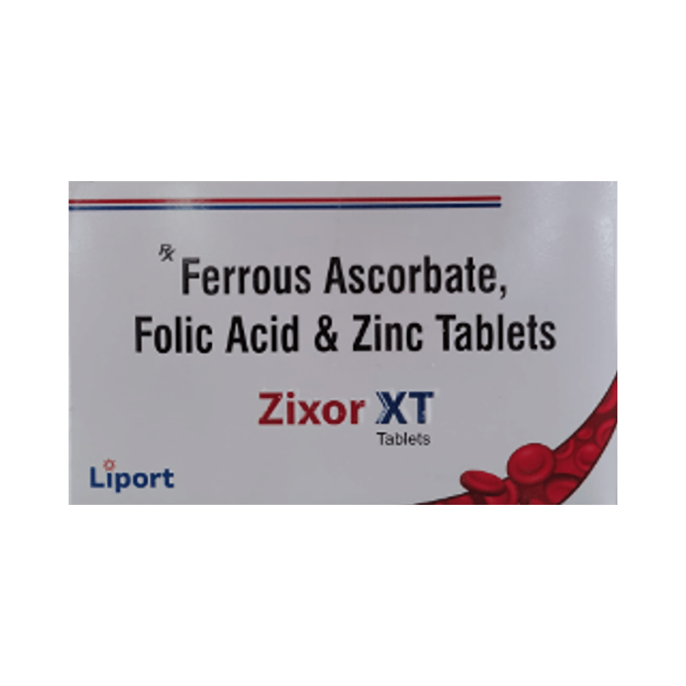 Zixor-XT Tablet is a combination of vitamins and minerals. Ferrous Ascorbate consists of iron and vitamin C. Iron replenishes the iron stores in the body and corrects iron deficiency anemia. Vitamin C promotes the absorption of iron in the body. Folic acid is essential for production of red blood cells. It prevents and treats folate deficiency and anemia. When taken by pregnant women, Folic acid prevents miscarriage, preterm labor, and neural tube defects in infants. Zinc is needed for the body's immune system to work properly. It plays a role in growth, wound healing, and maintaining gut health. Zinc is also required for the senses of taste and smell.