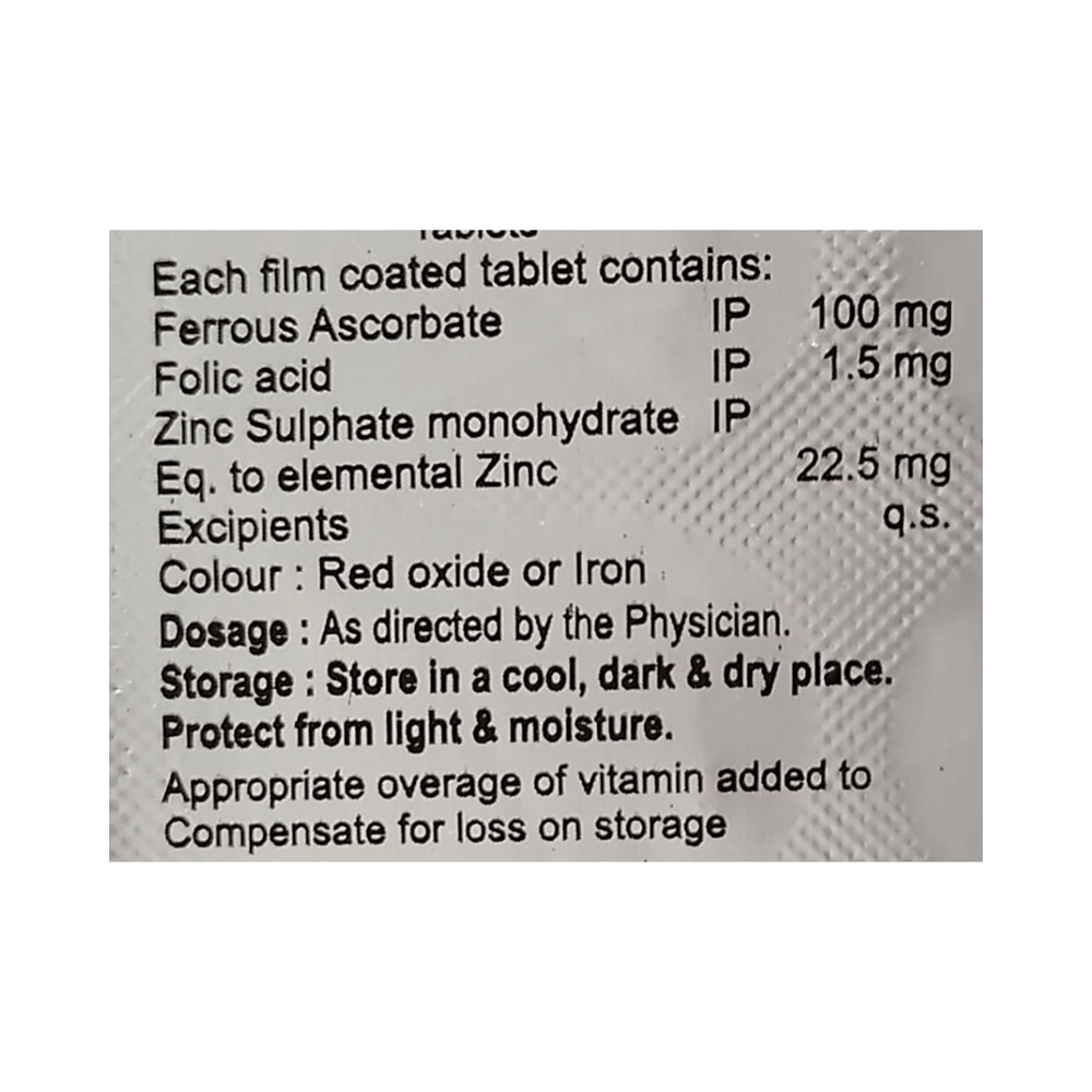 Salt Composition: Ferrous Ascorbate (100mg) + Folic Acid (1.5mg) + Zinc Sulphate Monohydrate (22.5mg)
